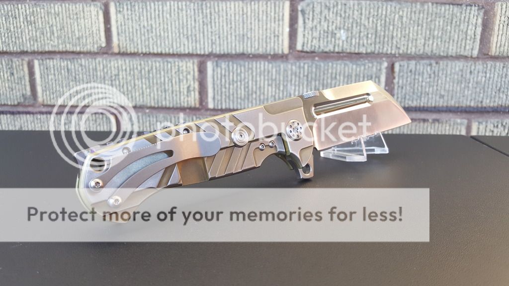 Very good to excellent used overall condition. I have carried and used this knife sparingly. Never ever hard used or abused. The pics will attest to that. Also, take a look at the crazy ano job on the inside of the back spacer, it's gorgeous. You can flip open, use fuller or thumb disk to open this knife. Ultra sharp original ADV edge. Blade is dead nuts collector center. No play in any direction, No lock stick. There are some very light superficial surface scratches on the knife. However, nothing significant, nothing deep. The action on this knife is one of the smoothest I have ever personally experienced, production or custom. Blade flies out and just about drop closes on it's own weight. Comes with original ADV pouch. Typically sells for $460.