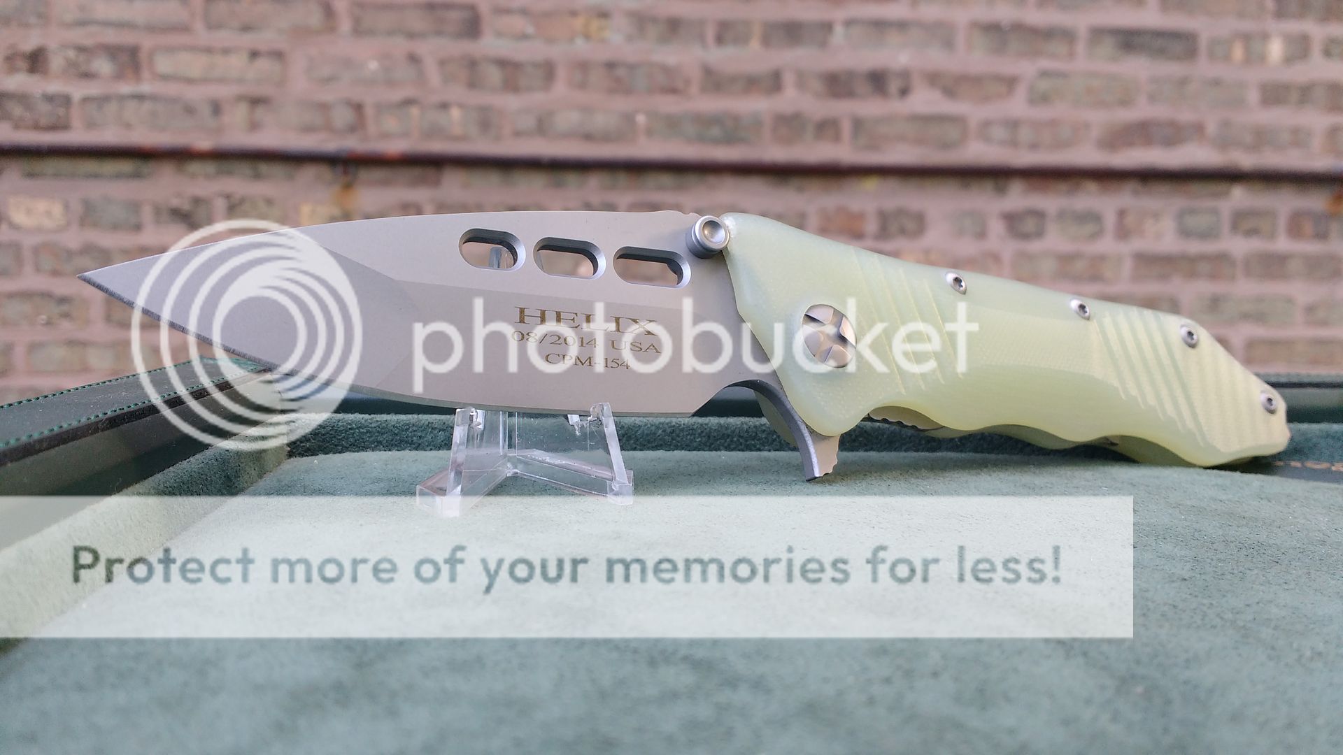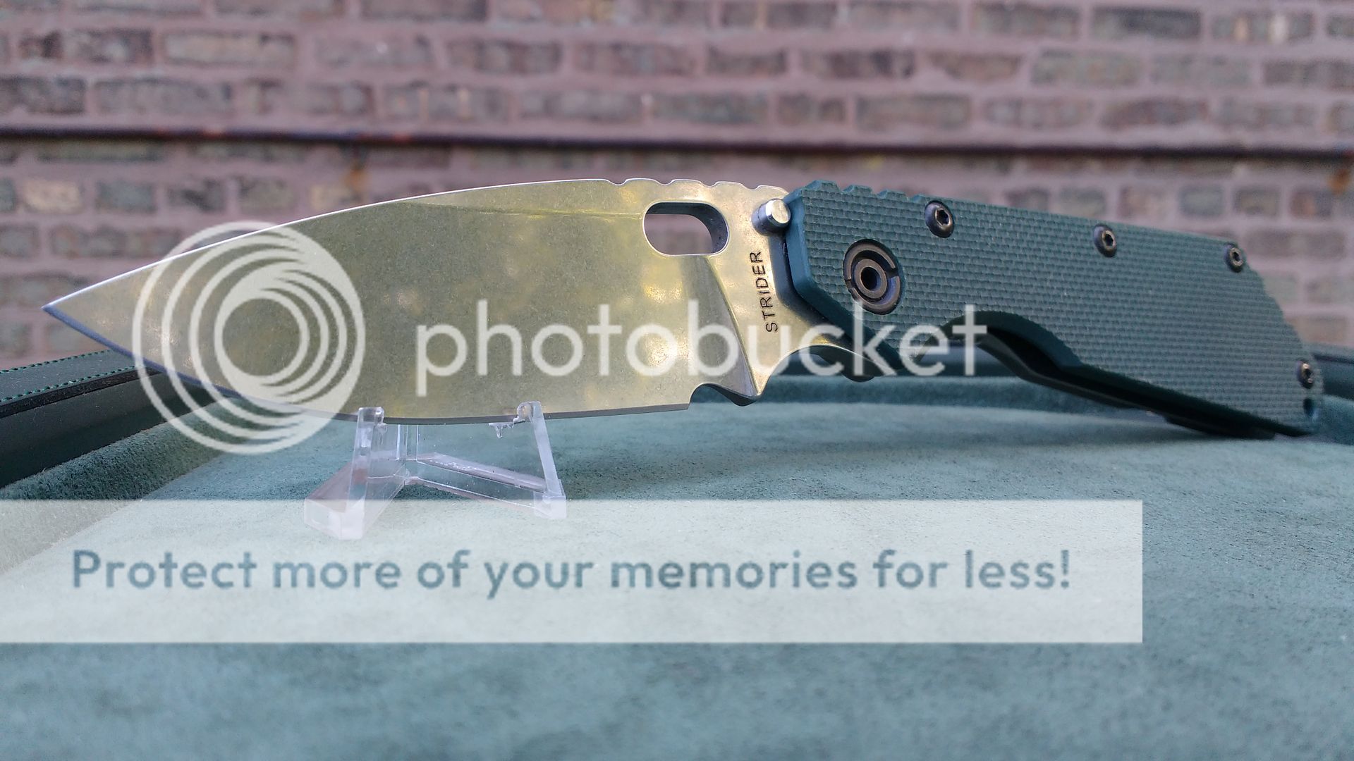 Near mint overall condition. Knife was purchased new in 5/2016 for $507. CPMS30V blade is centered, like new and has sharp original factory edge. No blade play in any direction. Knife is not even broken in broken. "Special Mission Green G-10" is in perfect condition. No flaws whatsoever on stonewashed titanium lock side. All the black body screws, pivot & LBS are like new. The pocket clip has one very faint superficial surface scratch. You cannot feel it if you run your fingers over it. I took a pic of it in direct light so that you can see it. However, in "real life", knife has to be held at an angle in direct light to see it. Comes with baggie and affixed Strider sticker as well as original sales receipt with personal info blacked out.