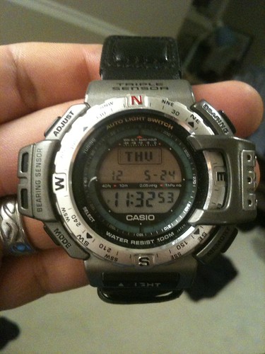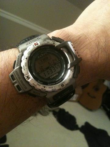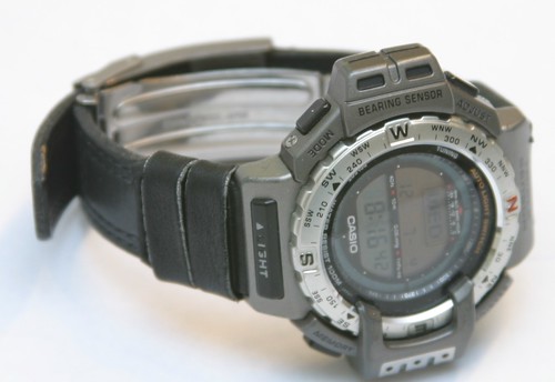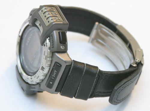 I've owned this watch for 15 years and I've taken good care of it. Battery was changed last year. It's in great condition, mostly because I've only worn it for about 10 days a year when I go hiking and camping. The printing on the "LIGHT" button (indiglo) has worn off a bit from use. This watch cost me over $300 when I bought it at REI. It has a digital compass, altimeter, barometer, multiple alarms, multiple timers, water resistant down to 100M, all the good stuff. Synthetic leather watch band adjusts very easily for sizing. No pieces to add or subtract and it's soft and comfortable. I rarely take off my Omega Seamaster and with my GPS I don't really need the compass anymore. I'd like to trade it for a LNIB Spyderco Paramilitary 2 or maybe a used Hest titanium folder? I'm open to ANYTHING though since this nice watch is not being used.