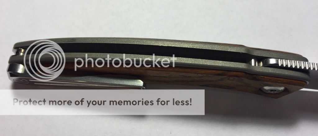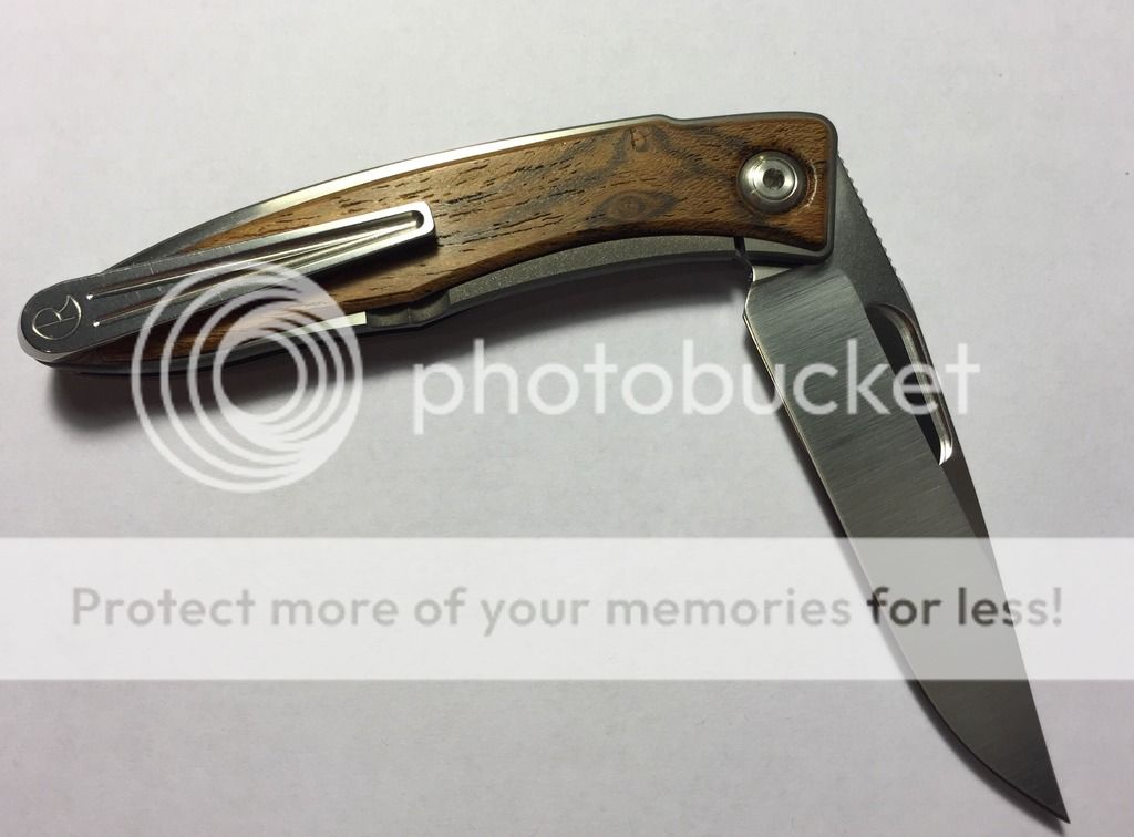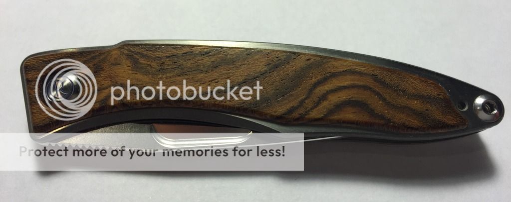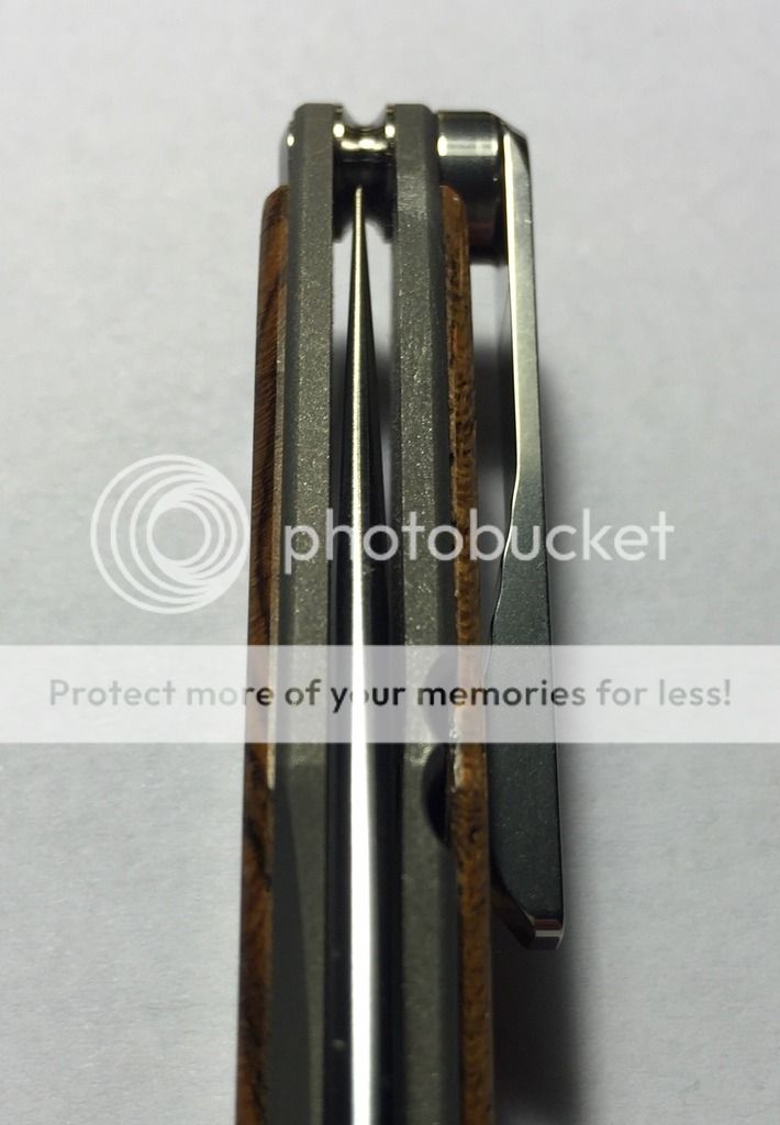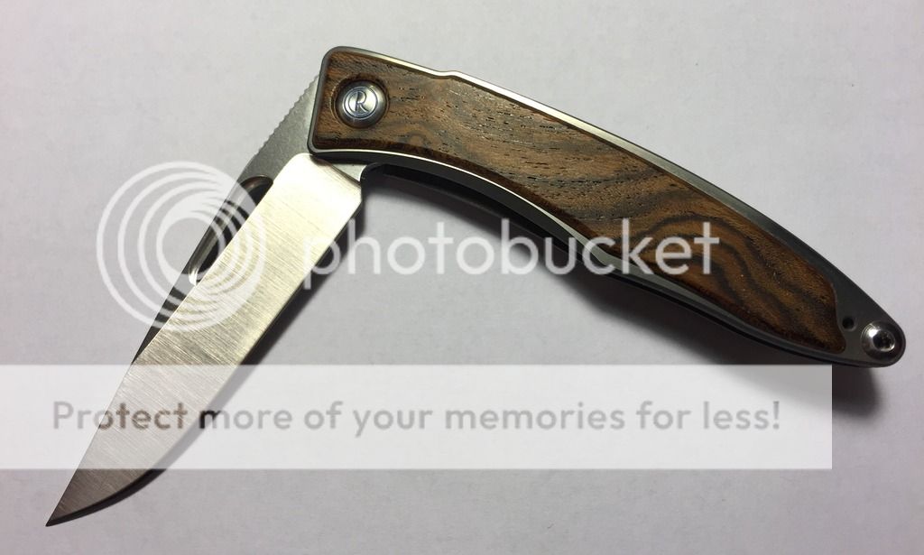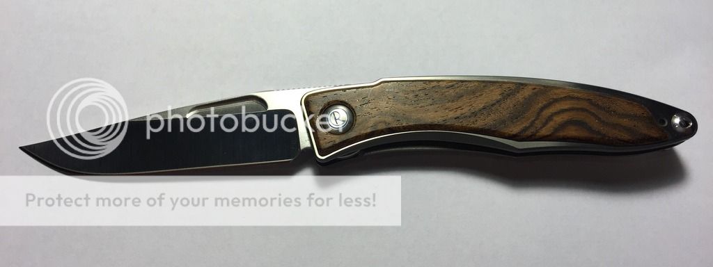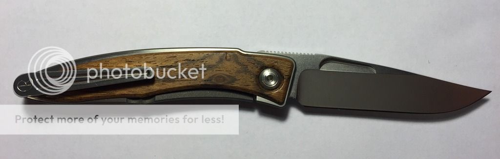 Gently used/carried, never sharpened, only stropped; very fine scratches on blade--nearly undetectable; a few handling marks on titanium, wood is gorgeous; blade appears to be a gnat's eyelash off-center.
