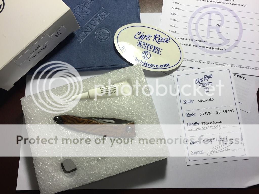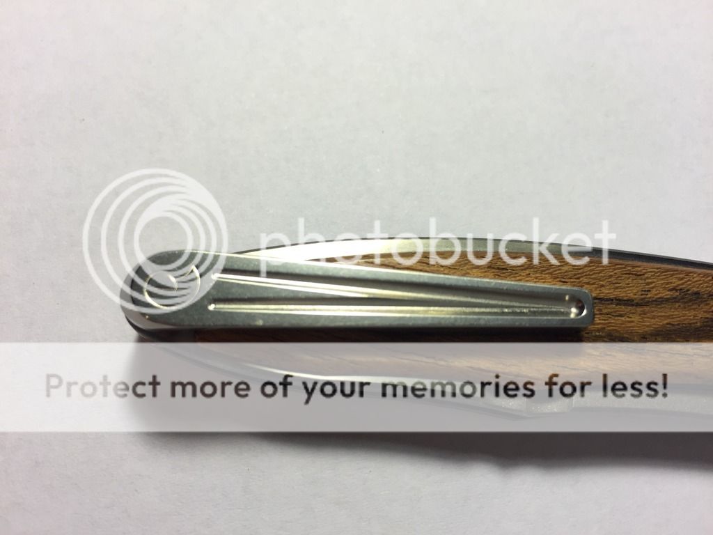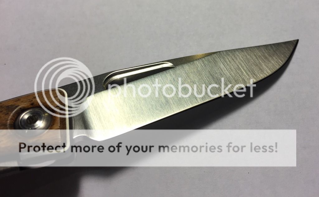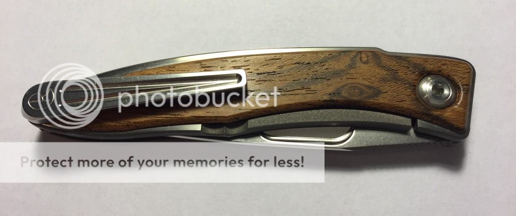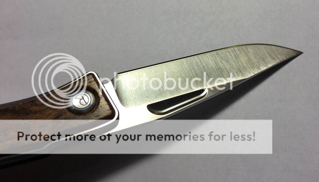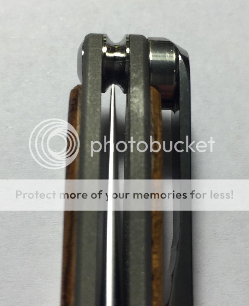 Gently used/carried, never sharpened, only stropped; very fine scratches on blade--nearly undetectable; a few handling marks on titanium, wood is gorgeous; blade appears to be a gnat's eyelash off-center.