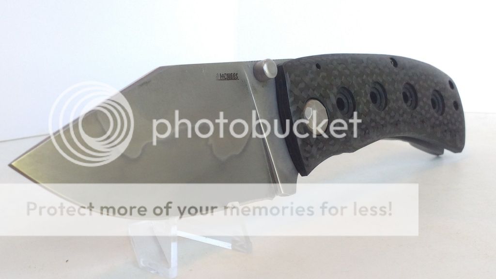 Just came back from complete refurbishing done by Mcnees Custom Knives. I wanted the knife updated so Jon Mcnees replaced the original carbon fiber scale with much higher quality carbon fiber without voids. He replaced the old blue G-10 backspacer with orange G-10 standoffs to give it a bit of subtle "pop". The knife is much lighter than a full titanium version of FMUK, making it a relatively light for a big beefy knife. The blade is centered. No play in any direction. No lock stick. Very smooth to open & close. Blade steel is 1095 with hamon pattern. Knife is in excellent overall condition with only a few minor of superficial surface scratches on blade. Knife has not been used or carried since refurbishing. Comes with original backspacer, COA, business card, sticker.