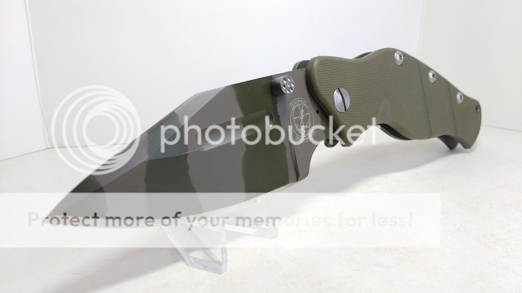 I believe this is a one off Sniper Bladeworks LPC, at least I've never seen another like it. Blade and titanium clip have matching GunKote tiger stripe finish. US flag is embossed onto titanium lock side. Thick blade stock measuring 3/8". Like new overall condition. I've carried this knife a handful of times around the house, never even outside. The hardest use it has seen is to cut a piece of paper. Blade is sharp & centered. Steel is not marked. Functionally perfect. No play, no lock stick. Solid early lock up. Silky smooth action.