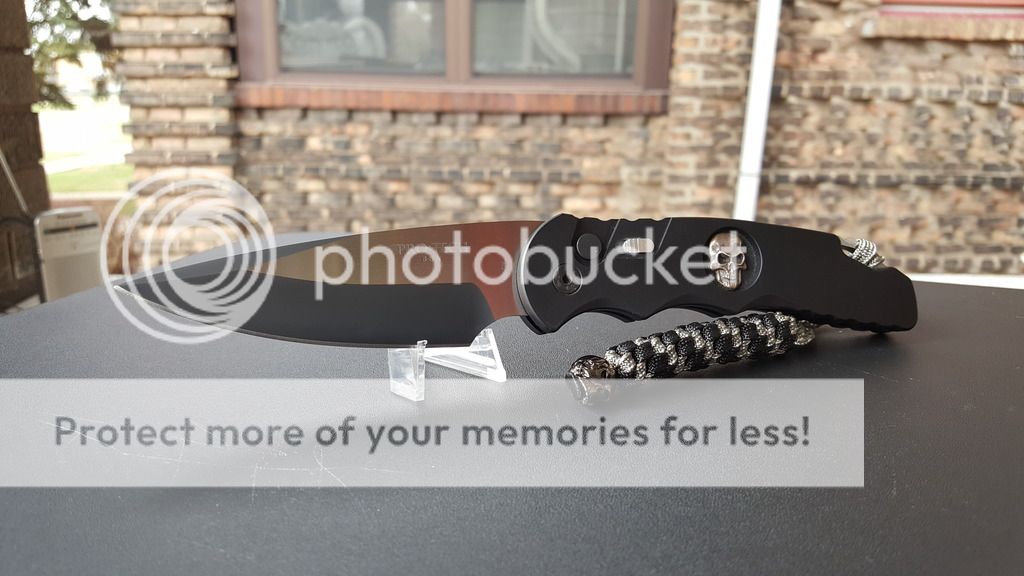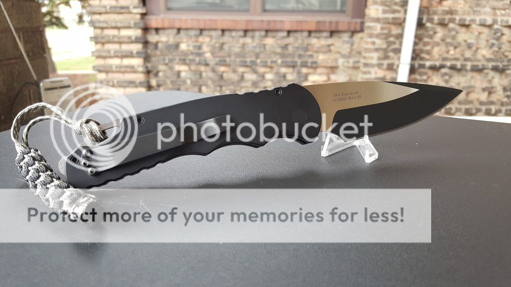 This is a limited edition TR-4 Skull knife, #24 of 200. Bruce Shaw designed sterling silver skull that is set into the black anodized aluminum handle. The 154-CM steel blade is two-tone finished black and satin. The blade itself has seen absolute minimal use. There are a very very few superficial harirline surface scratches that can be seen with magnification. The handles have only a few "snail trails", again nothing significant. Nothing that you can feel if you run your finger along handles. Pivot and hardware are all in excellent shape, nothing stripped or mangled. The blade is dead nuts, collector center. No blade play in any direction. Blade fires out with authority, no actuator stickiness whatsoever. Personally, I think Protech makes better single action automatics than any other knife company because of the fit, finish and overall quantity. Comes with box, Protech sheath, literature and custom 2 tone skull lanyard. Original MSRP $425.