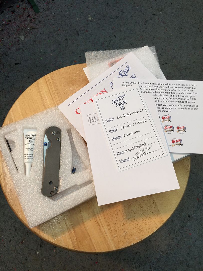 Small CRK Sebenza 21. Bought from Knivesshipfree, it's been carried some, but is in excellent, outstanding condition. I'd call it LNIB, but it has been carried some and probably opened a box or two, maybe some mail. I did open it up and relube it with Nano Oil. Only wear I see is a snail trail on the clip and on the front edge of the clip. The handle could have a snail trail or two, but as mentioned, it's in pretty much LNIB condition. $315. Price includes domestic shipping, PP preferred.