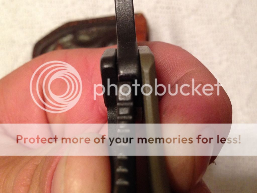 This knife had some work done to it from the previous owner (Bellablades). He carbidized the thumb studs, behind the tip on the spine, and the lockbar face. I believe the lock is starting to stick because the carbidizing is wearing off. I could be wrong.