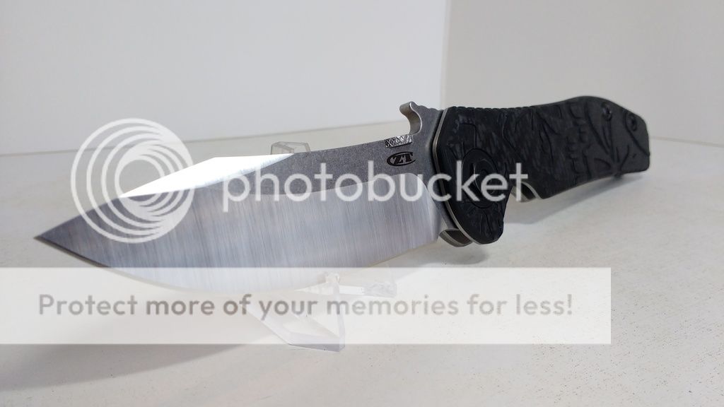 ZT0630 with custom "Emerson Skull" carbon fiber scale professionally done by suingab (http://g10.lt/). The cost of custom scale alone is $75. The knife is in excellent overall condition. There are a few superficial surface scratches that can only be seen upon detailed inspection. I wasn't really able to pick them up in my pics. The S35VN blade is very sharp and has original factory edge. No blade play in any direction. Solid lock up as you would expect from ZT. Zero lock stick. Action is smooth. The centering is a "smidge" off to the presentation side. Does not affect functionality in any way whatsoever. Comes with ORIGINAL G-10 scale, box, papers, bubble wrap & suingab business card.