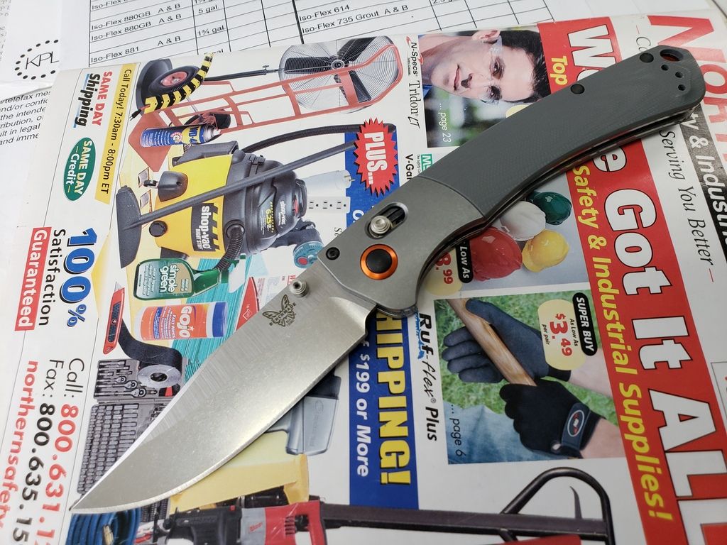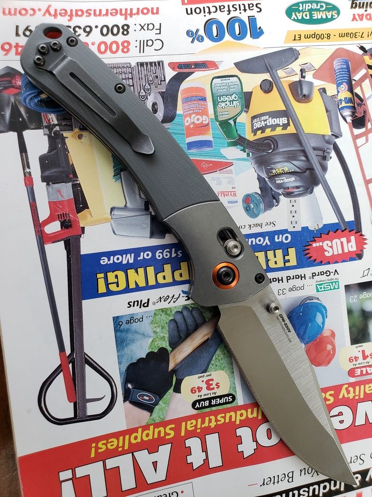 Up for sale is my light user (closer to LNIB) Benchmade Crooded River in S30V blade steel and gray G10, including the original box, drawstring microfiber bag, plastic bag, and paper pocket clip shield. I bought this one to try out the model for size. I like it, but I am now wanting to do a Benchmade custom order with CPM20CV steel.