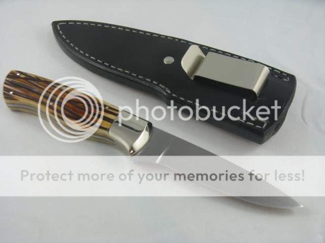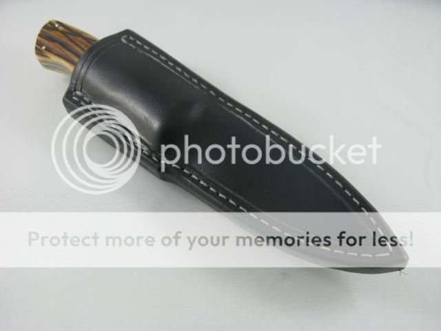 Sheath is handed made of 8-9oz black drum dyed tooling leather with belt clip