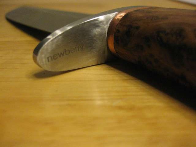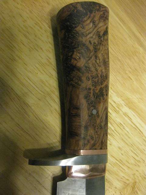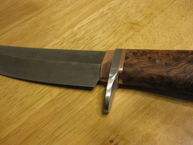 The copper steel copper in the fittings really makes it POP! The placement of the makers mark is one I've never seen, I like it. Great looking knife.