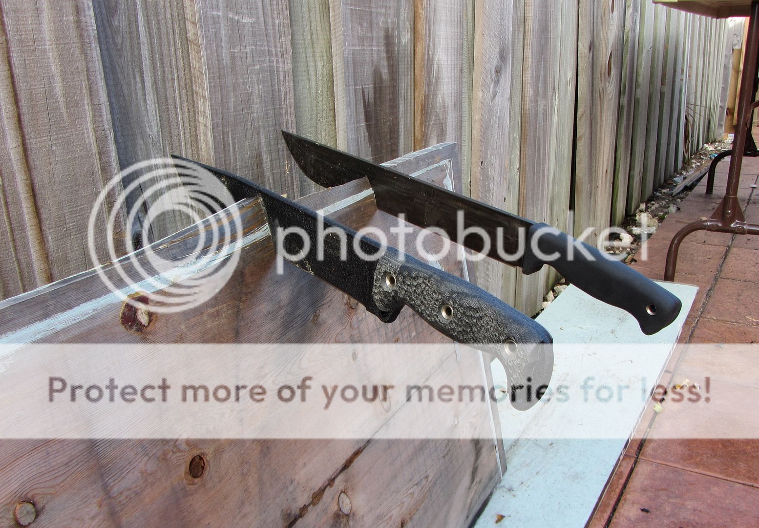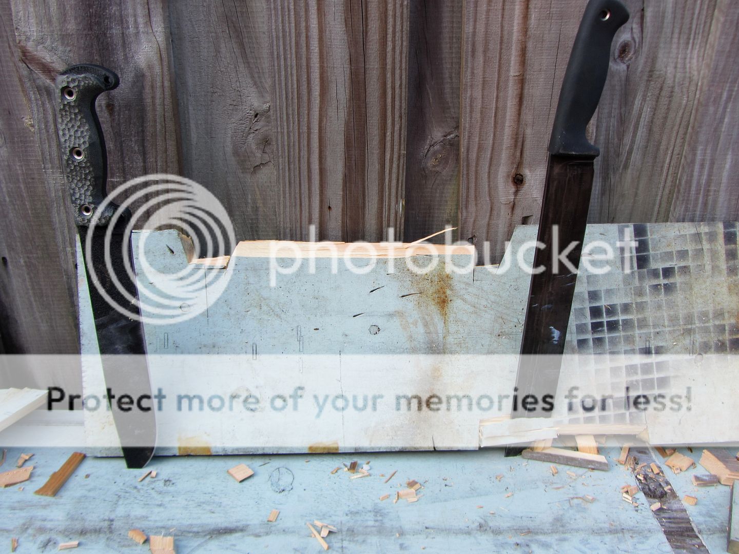 One more time. 20 whacks for each blade. Both went completely through the first section which broke off and into the second. Almost dead on.
