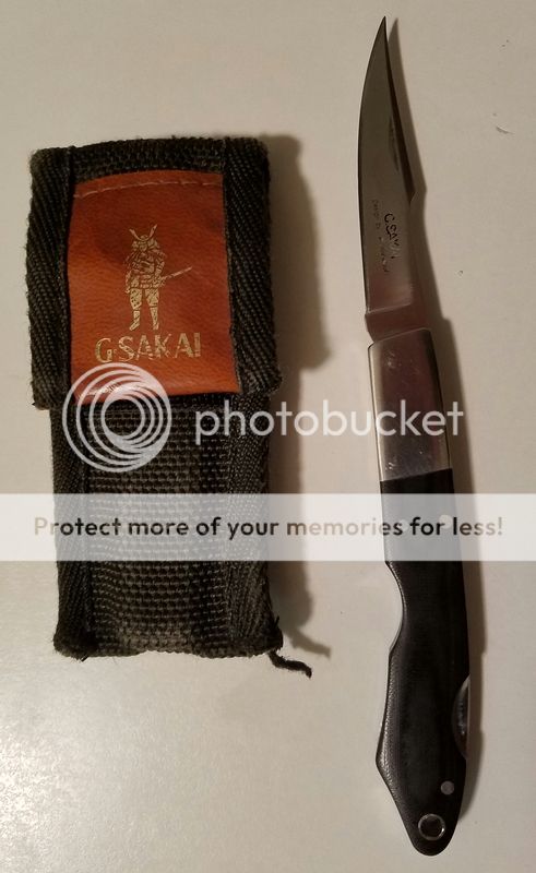 Gun show find, this G. Sakai folder with original nylon sheath. Knife is used but is in good condition. sheath shows some wear, see photos. knife locks up tight and has no play in blade, handles look good. The picture shows that some of the black inside the lettering on the blade has worn off, knife appears to be sharpened. It is in the exact condition it was in when I got it at the gun show. I have not carried it or sharpened it. Feels good in the hand and appears really well made.
