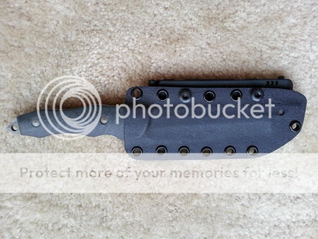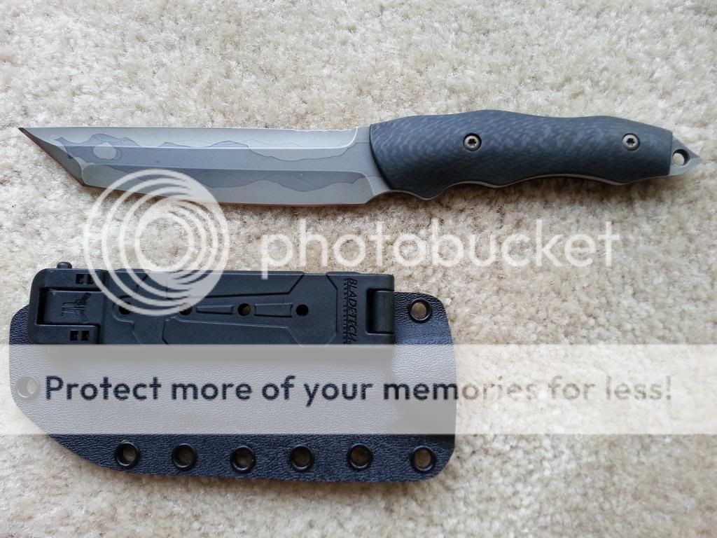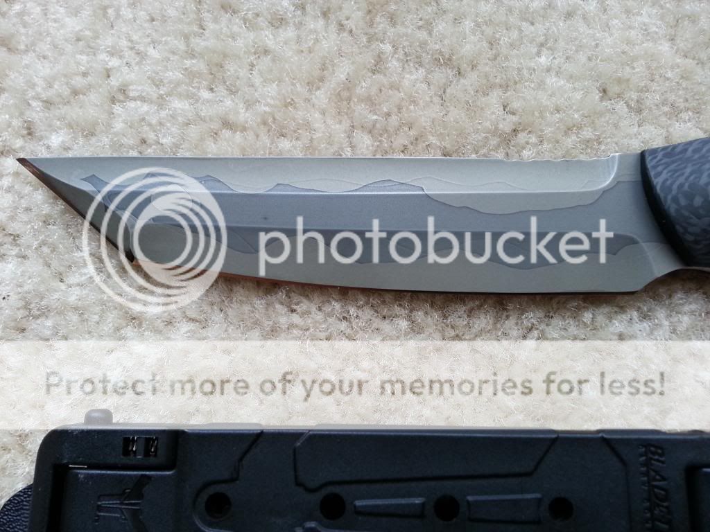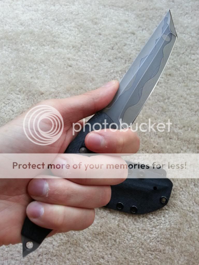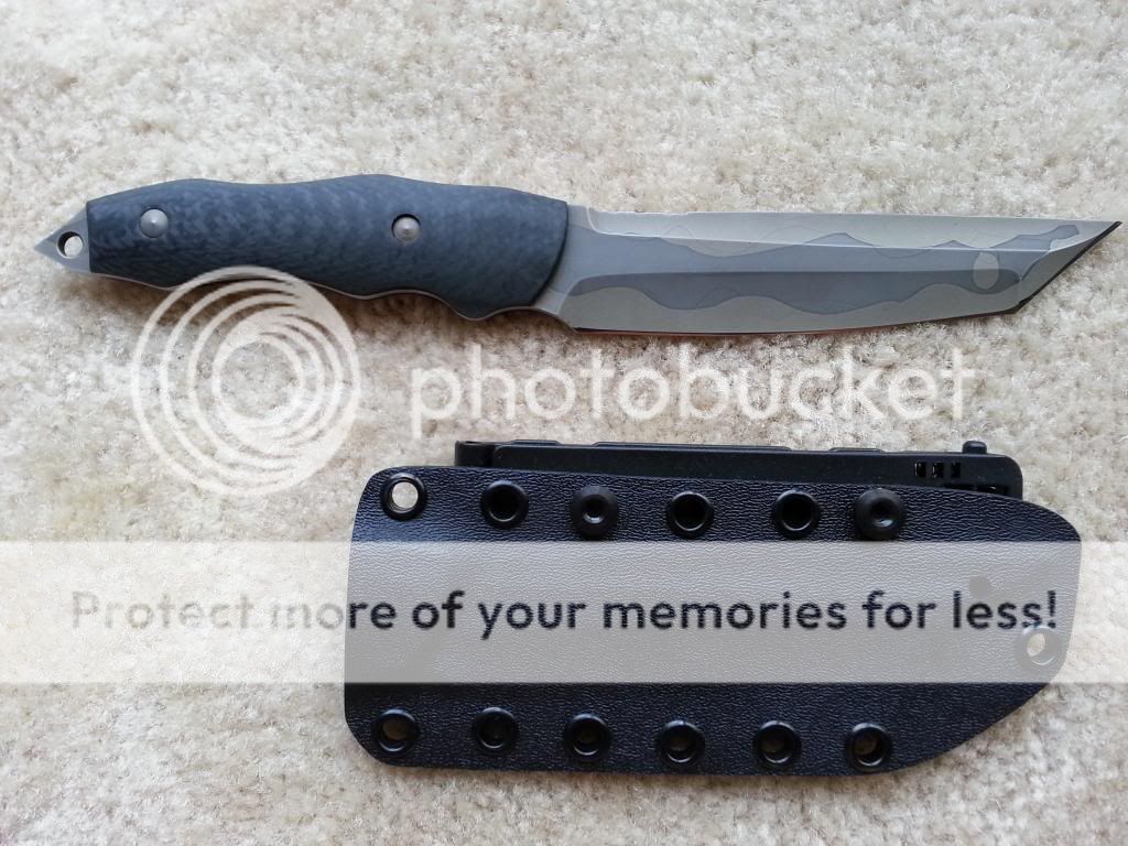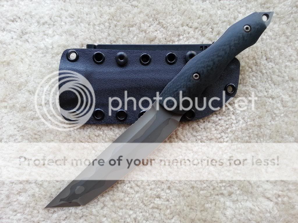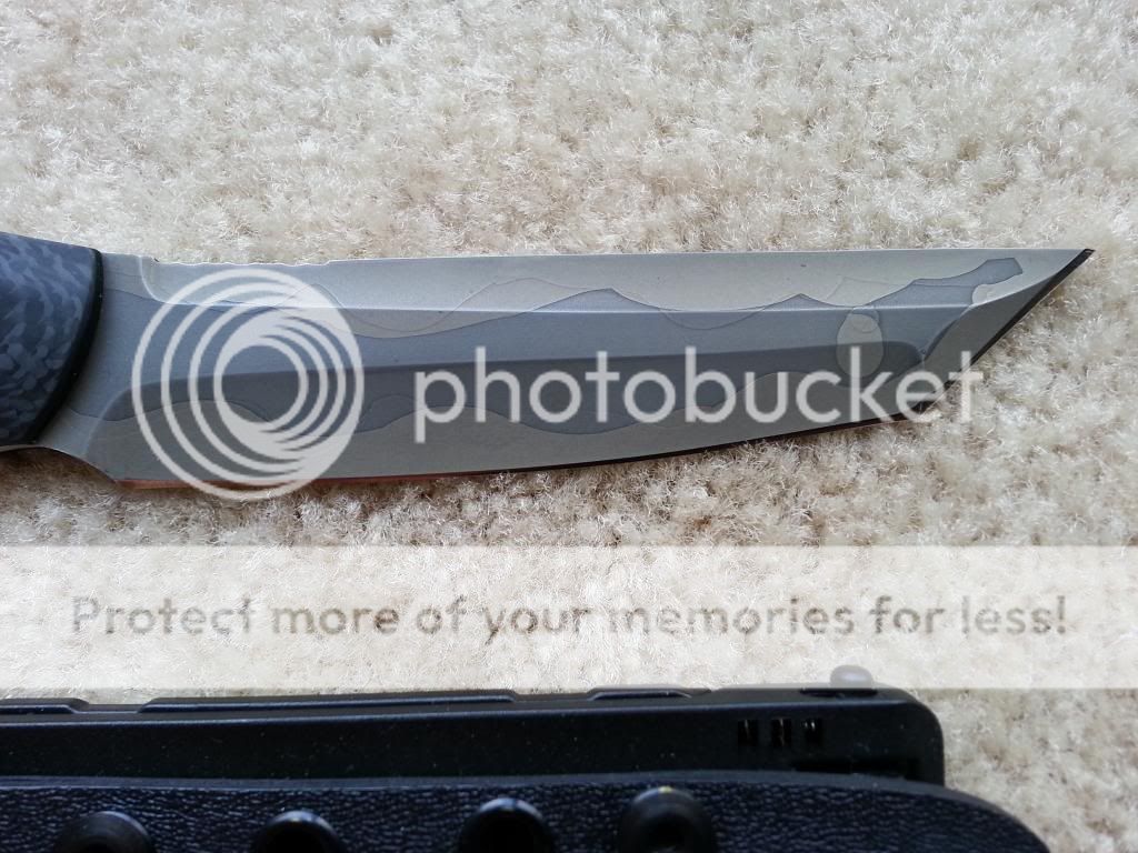 It's an aggressive Americanized tanto design done in CPM 154 and differentially heat treated to bring out an awesome double hamon. If you look closely in the photos you can see it. In person it's really apparent. The finish is a flat bronze color and the scales are done in smooth carbon fiber. Kydex sheath is very low profile and friction fit with metal molle capable clip. Has kind of a breaker pointed pommel as well, heat treated the same as the rest of the blade.