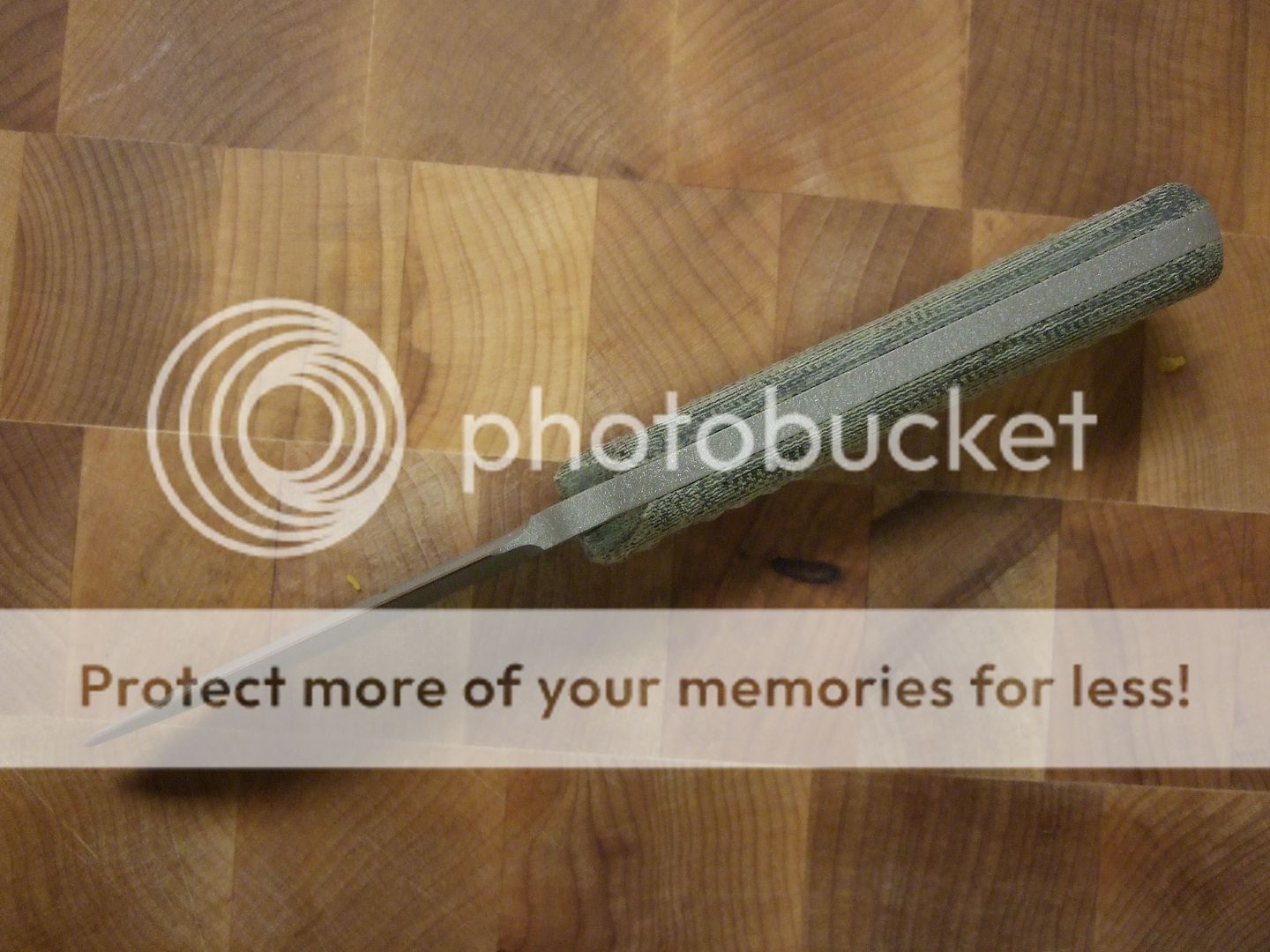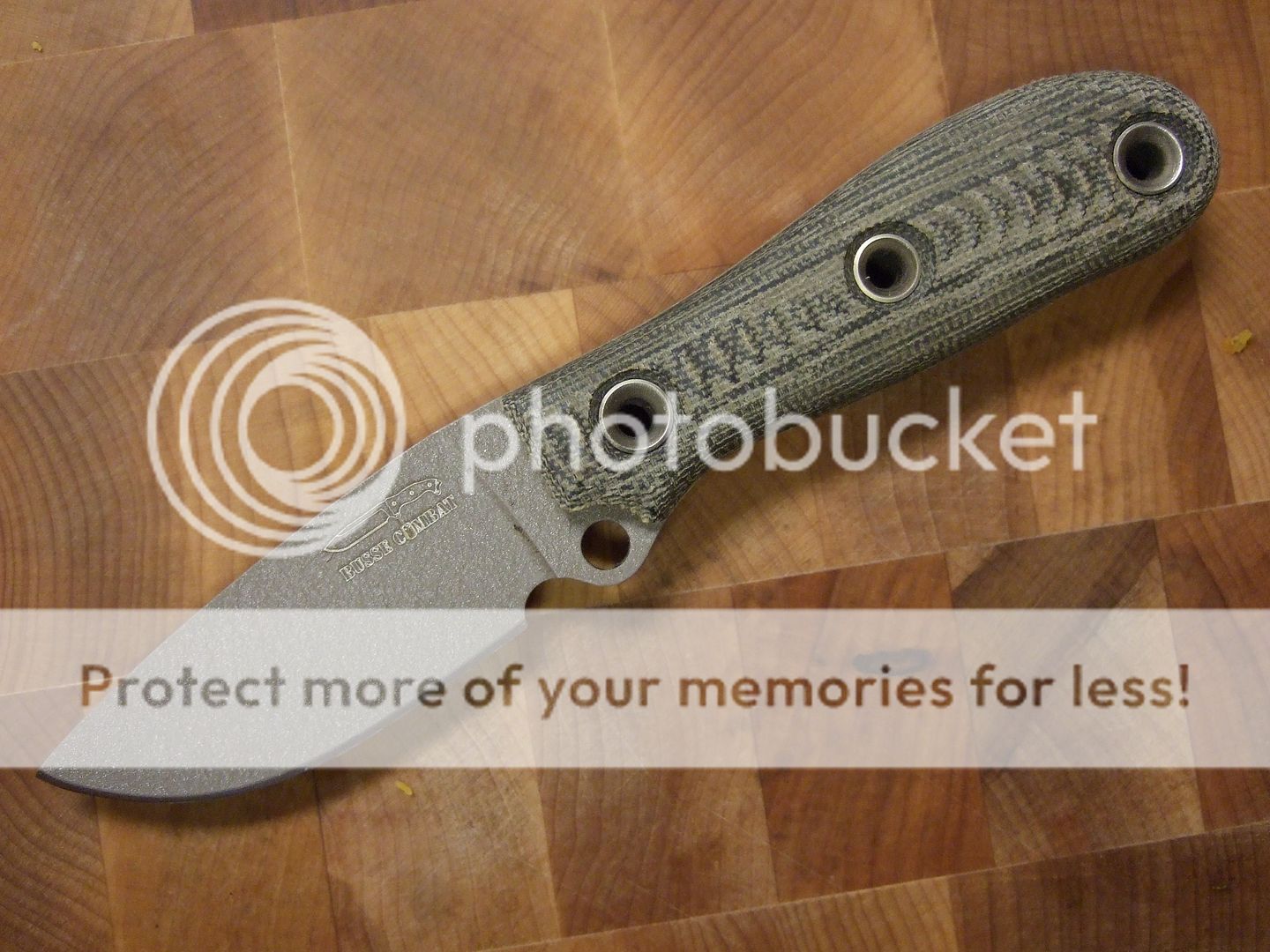 Up for sale is a "Sage Warden." It's a Game Warden with Sage Crinkle Coat and Black Canvas Micarta. The official specs say it's .190" inches thick/ I haven't measured it myself, but that looks right. It's new and unused, just as I received it from the Busse Company Store back in 2007, complete with Tactical Cardboard Sleeve.