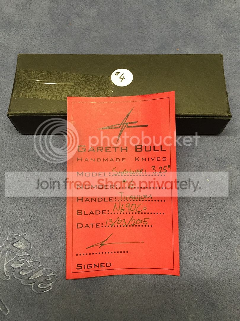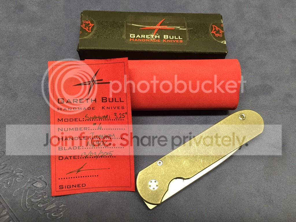 Gareth Bull Shamwari 3.25" N690C Stonewashed. Newest version of the Shamwari with matching numbered box and birthcard (not always included with GB's). Best looking run of Gareths Shamwaris imo with heavily stonewased blade and TI scales. I carried this a few times but only opened one package with it. Few light marks/trails from carry but nearly impossible to picture with stonewash. Factory sharp blade never sharpened or stropped. Perfect example with excellent action, early lockup, nice centering, no stick. These don't come up often, especially not this nice with matching box and papers etc.