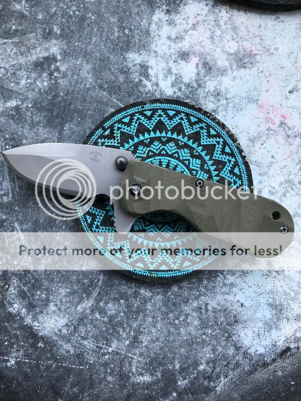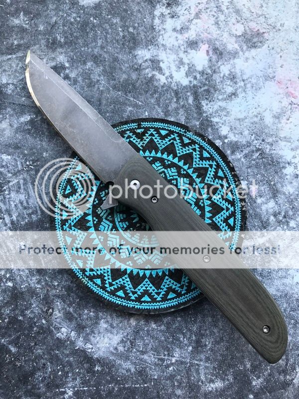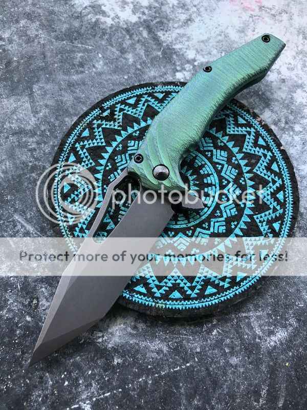 This is an interesting knife indeed. Carried and used but not abused. This was originally a tanto but was reground by the maker to be a drop point (with a slightly thicker than usual tip). Runs on caged bearings. Flips open with authority when flipped the right way. CPM-154 blade and olive green micarta presentation scale. This is almost a completely hand-made knife, it doesn't have the absolute tightest tolerances but is a wonderful piece of craftsmanship nonetheless. A bit of blade play, and the blade favors the presentation side a tiny bit but does not rub the interior of the scale at all. Blade has been sharpened by previous owner and it is SHARP! A few signs of carry on the lock side scale. Comes with COA and a few ODKW stickers.