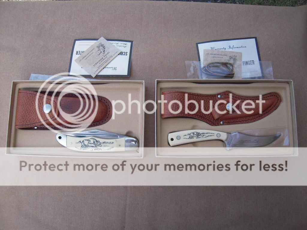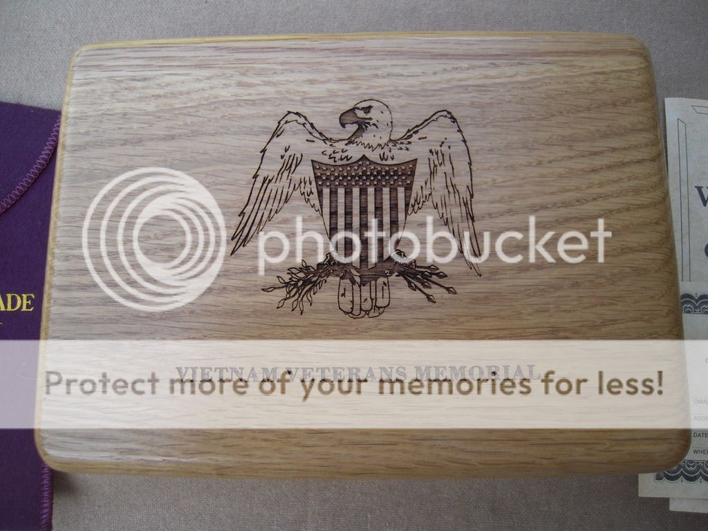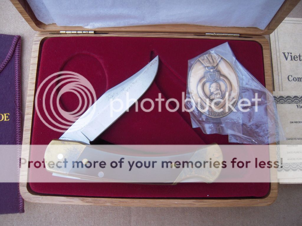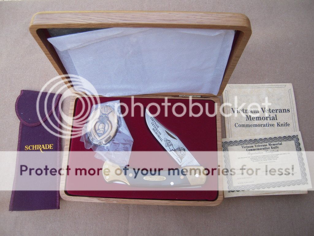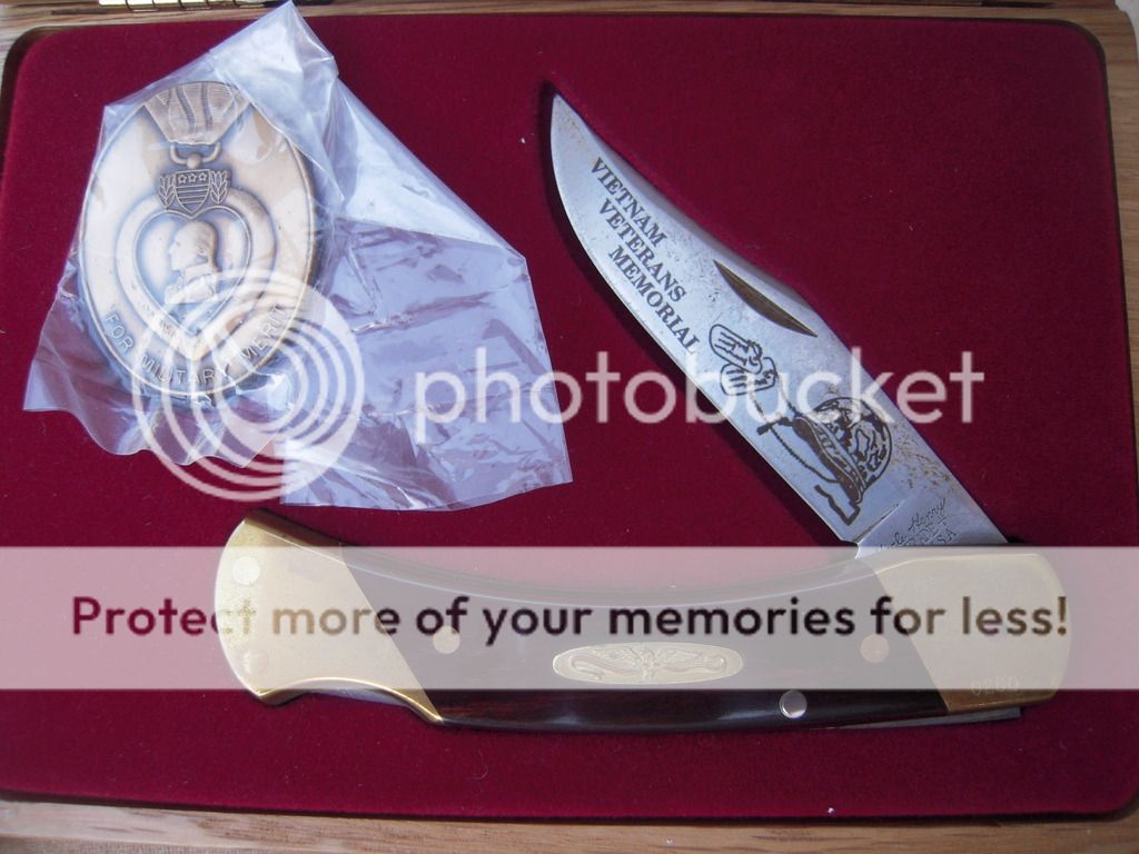 Schrade USA Vietnam Veterans Memorial Commemorative LB7 - Serial number 0260, in laser engraved oak box with all the bling. LB7 Lockback with Schrade+ Stainless etched blade, brass bolsters and special shield. Comes with a medallion resembling a Purple Heart medal, protective cloth cover, and all papers. Beautiful knife! Bolsters are tarnished but will clean up to new, and the blade has the original protective oil dried on it. That is NOT rust you see in the picture. Asking $100 OBO. SOLD
