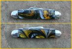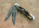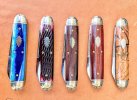 I've shown these all as a group back on page 8, but here is the individual shot of each knife. Originally made for Perry Miller in 2010 as an SFO. Perry owned the Tuna Valley brand, and had GEC make 100 knives each in Brazilian Cherry, Jig Redbone, and Burnt Stag (2 redbone ones didn't pass inspection, and so only 98 were made). Perry passed away shortly after, before the knives were all sold. The Daniels Family acquired the rights to the Tuna Valley brand, along with Perry's unsold inventory. In order to sell the remaining inventory, and keep them differentiated from the original ones Perry had sold, they modified the bolsters, and the knives were re-released in 2012. The wood and bone ones had the bolsters dimpled by Prater at Painted Pony in Georgia, and the stag ones had the bolsters engraved by jewelry artist Oiseau Metal Arts. Here are the total quantities that were sold of each type.