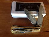 Scagel by Northwoods series 12 trapper. Stag scales and trademark arrowhead sheild. Blades have patina but are in excellent shape. Comes with PVC box. Asking $135 Now $pf