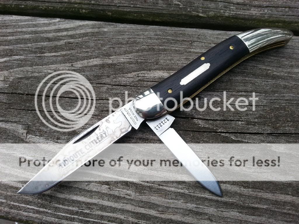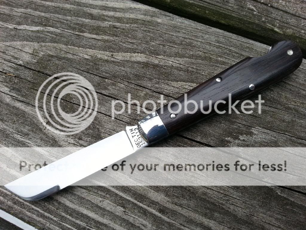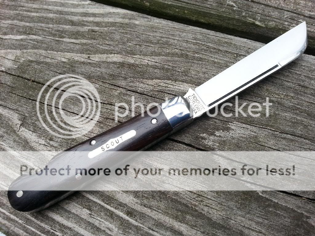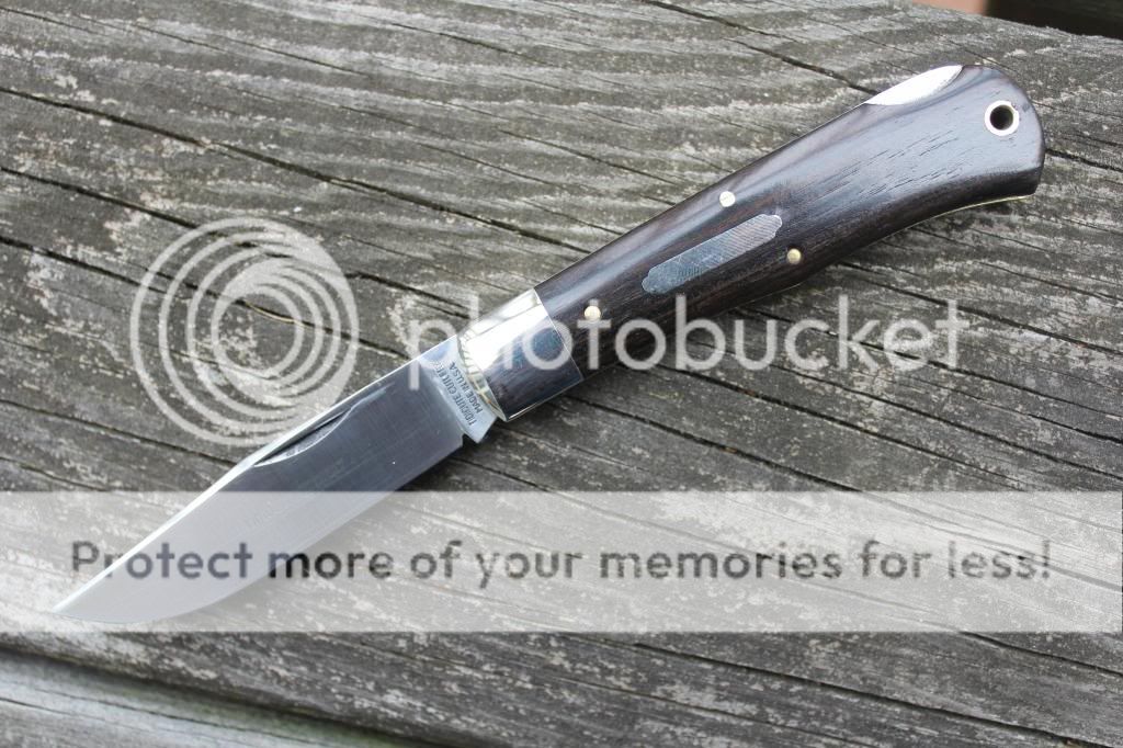 #72 Cody Scout, Wharncliff, Ebony - SOLD///$60 - Great/like new condition, carried and used once or twice to open a package although it's hard to tell looking at the knife now. Scales are predominantly brown/dark brown. I don't specifically recall but I might have carefully sharpened and/or stropped it. Very slight vertical blade play that should not affect use.