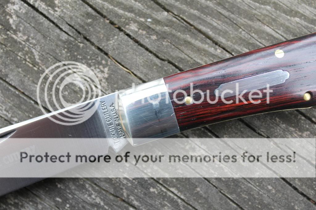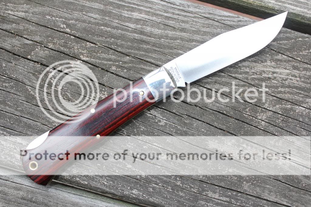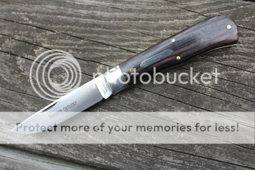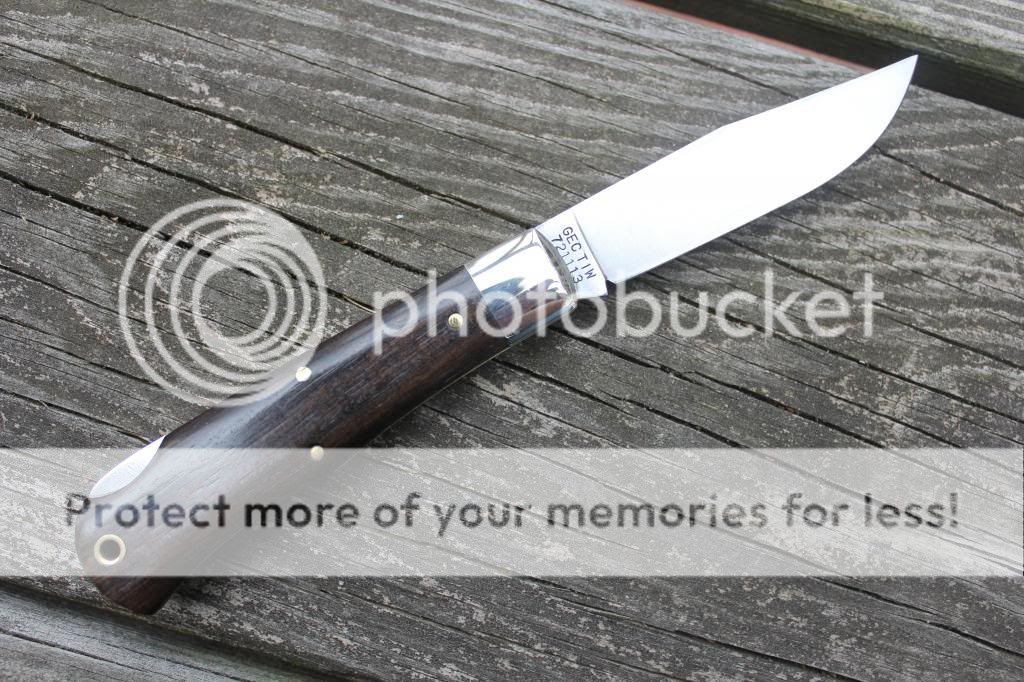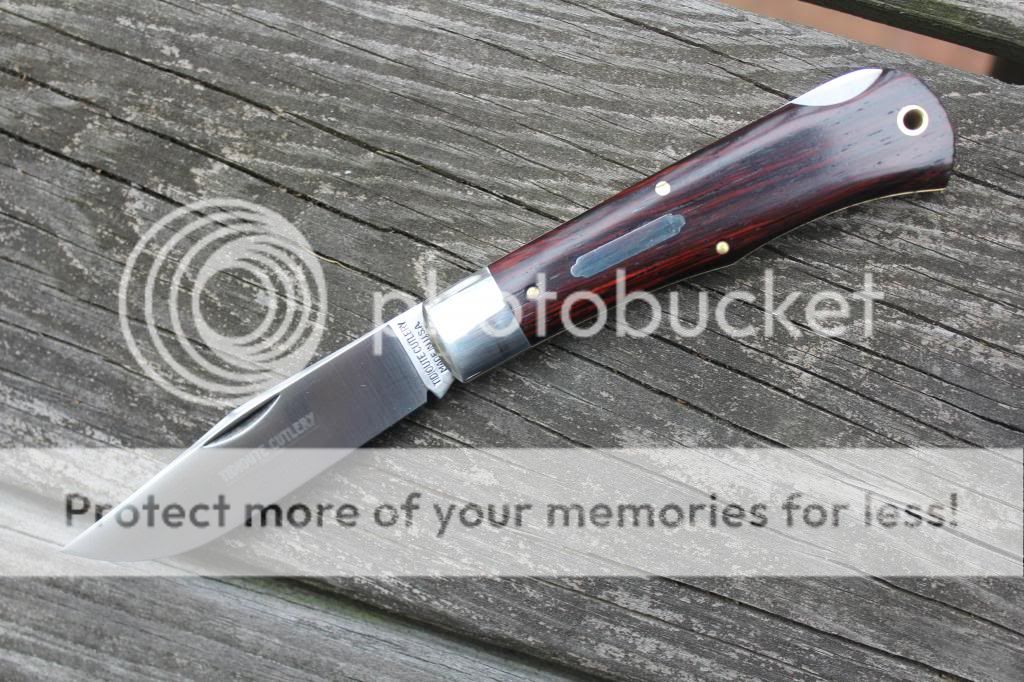 #42 Missouri Trader, Cocobolo - $94 - New in tube, never carried, never used, just handled a few times. It is my understanding that this was part of a very limited run and only a few of these were made. Came from the factory with some slight blemishes. There is some kind of rub mark on the bolster and a faint scratch on the scale. Both of these issues look like they could be buffed out. One side also looks like small grooves from the lower grit sanding was not completely finished out. Hard to notice them holding the knife. Very slight vertical blade play that should not affect use.