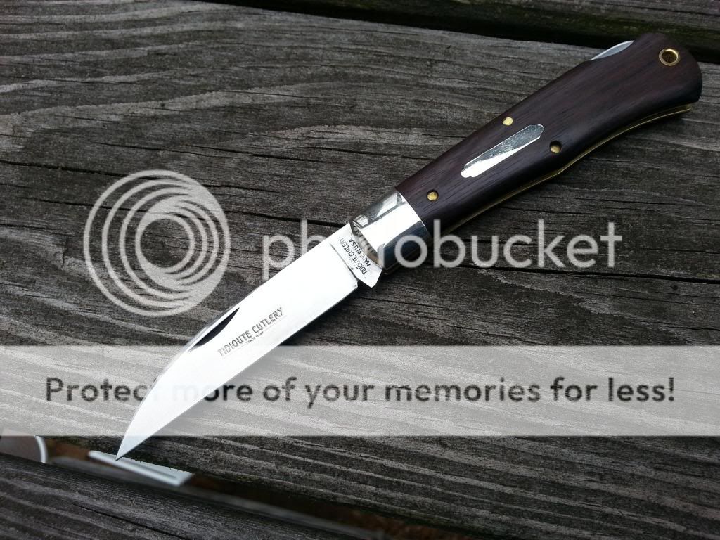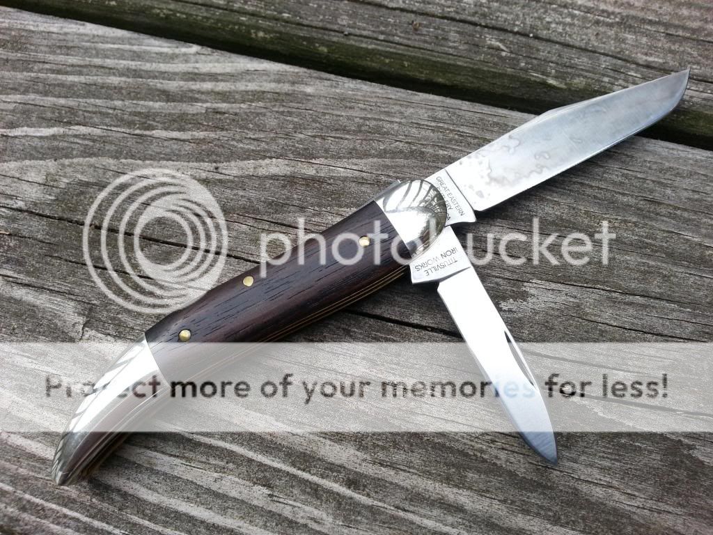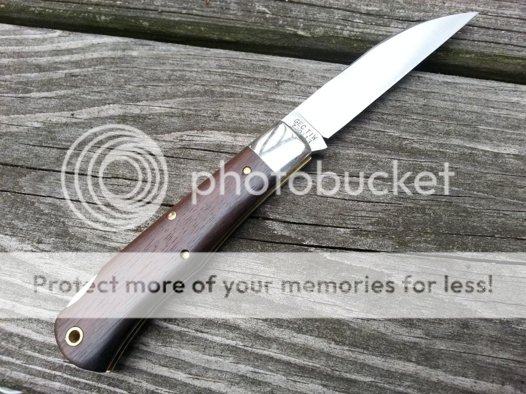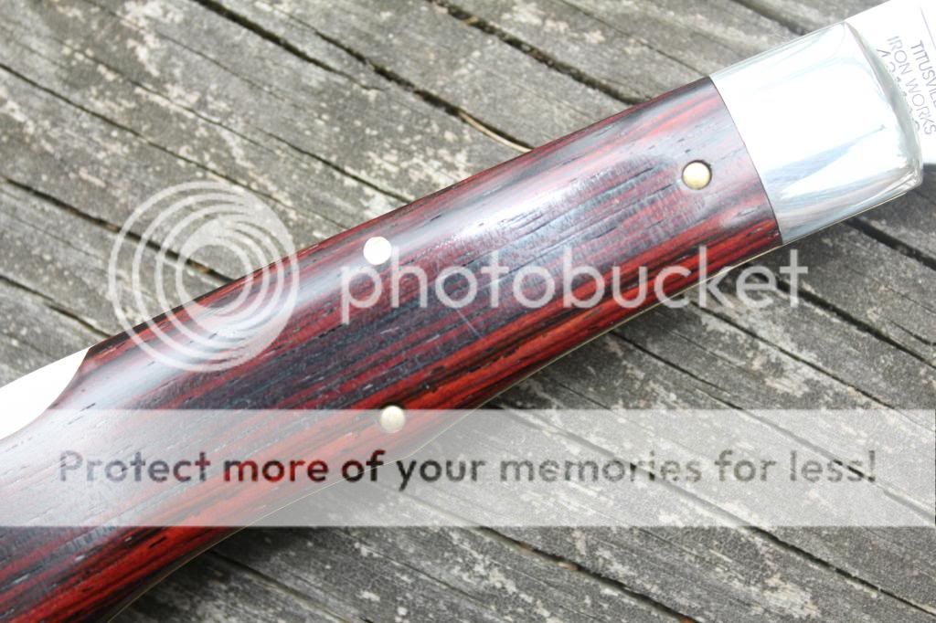 #42 Missouri Trader, Cocobolo - $94 - New in tube, never carried, never used, just handled a few times. It is my understanding that this was part of a very limited run and only a few of these were made. Came from the factory with some slight blemishes. There is some kind of rub mark on the bolster and a faint scratch on the scale. Both of these issues look like they could be buffed out. One side also looks like small grooves from the lower grit sanding was not completely finished out. Hard to notice them holding the knife. Very slight vertical blade play that should not affect use.