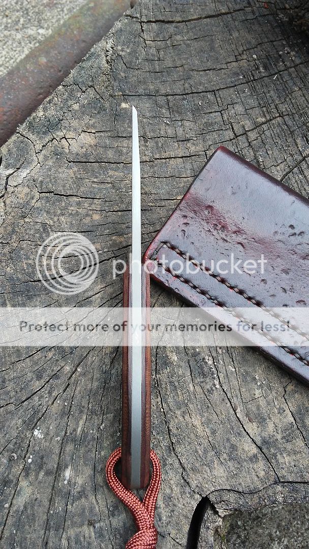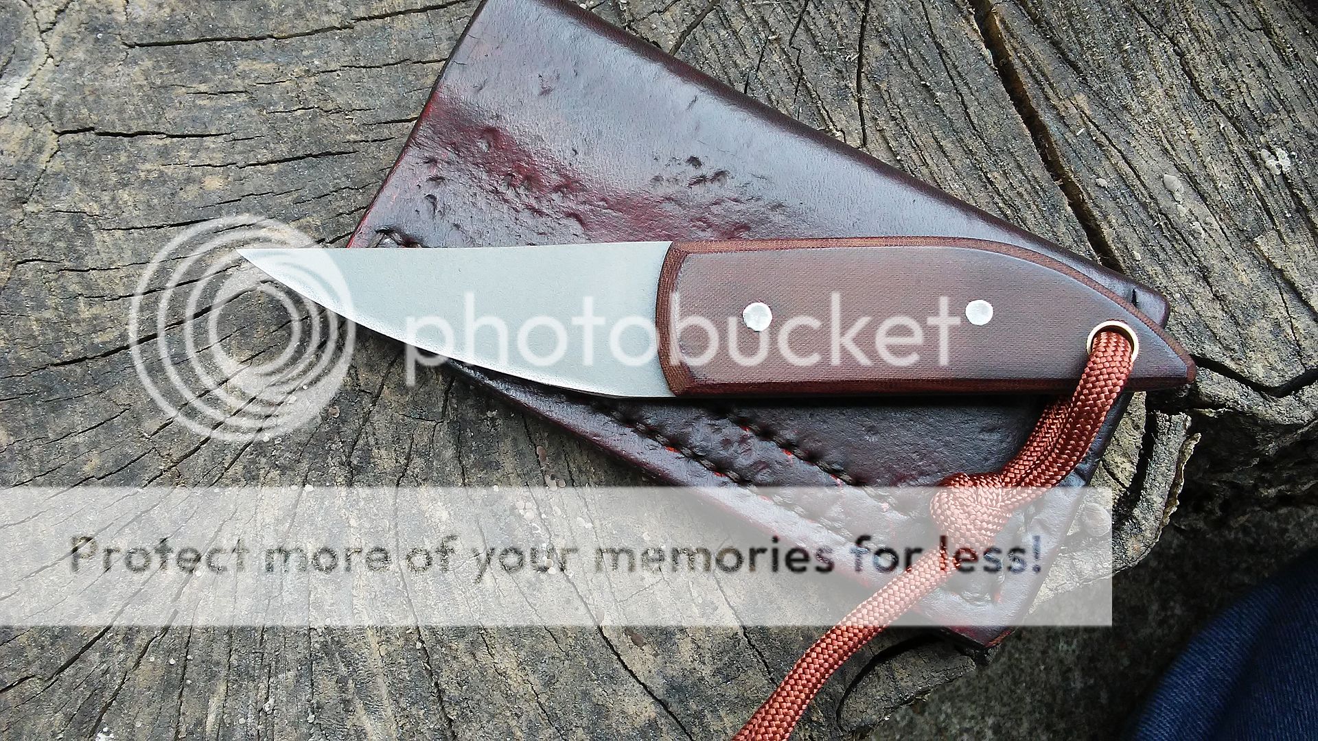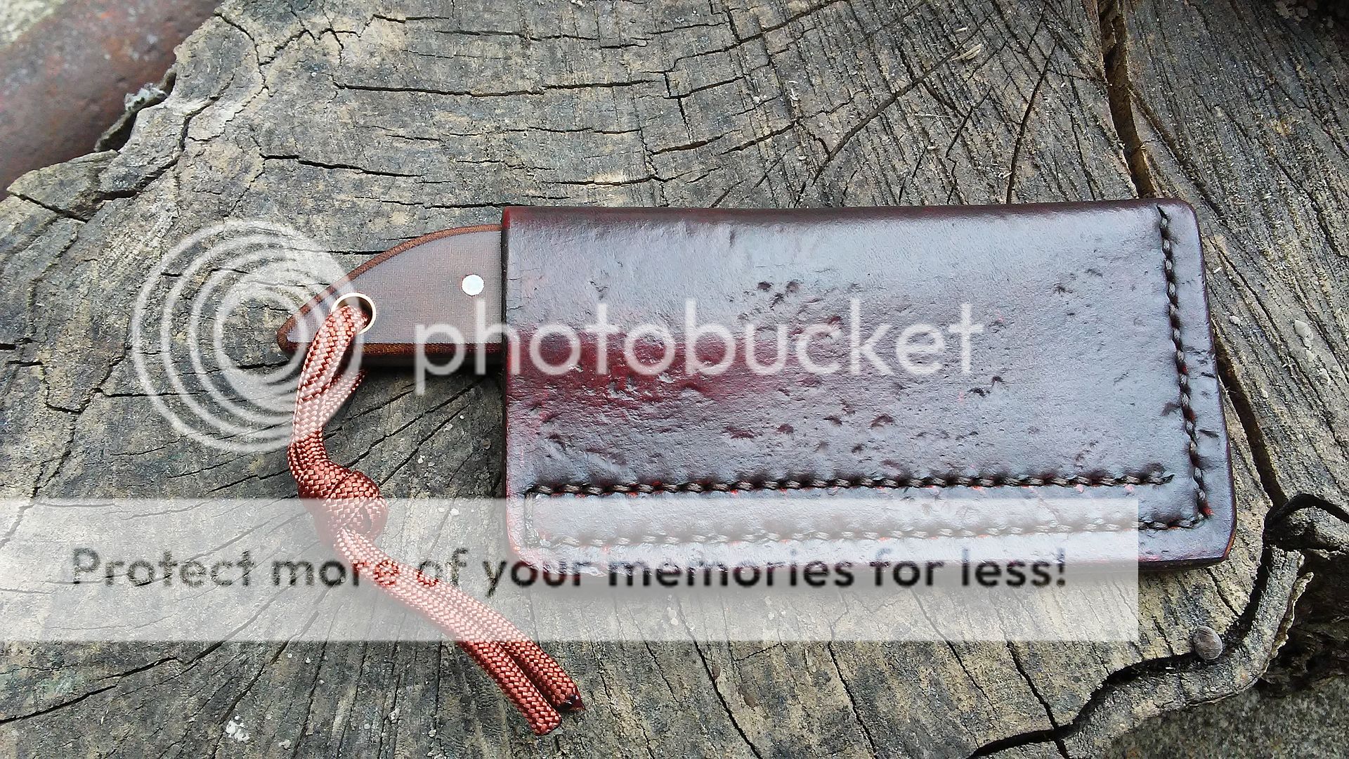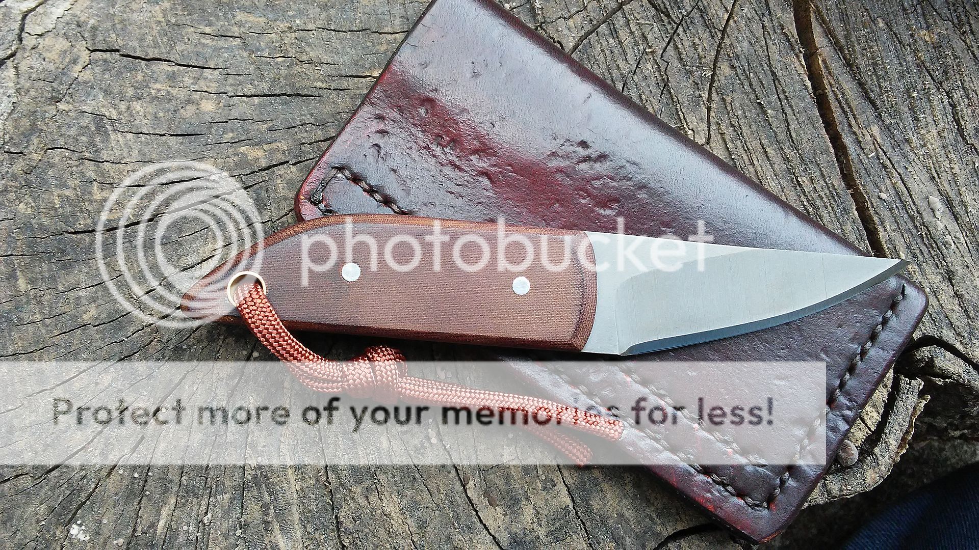 This kiridashi is made from AEB-L stainless steel. It was heat treated to be 59-60RC in hardness. The blade is ground with a right side chisel grind and the handle scales are made from red canvas micarta with aluminum pins and brass lanyard tube. It comes with a nice leather pocket sheath.