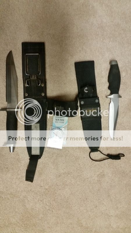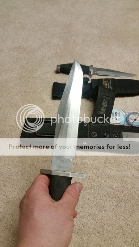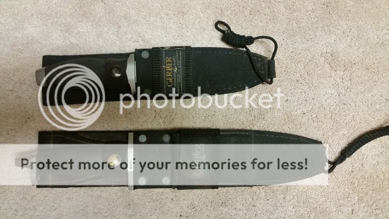 I have two knives for sale. One is a vintage Gerber lmf and the other a bmf. Both are used and have been sharpened. Bmf has some rust pitting on it. I was able to clean the bmf up with rust erasers. I have added a plastic sleeve into the bmf sheath to help with rust issues. Great knife to add to a collection of use outdoors!