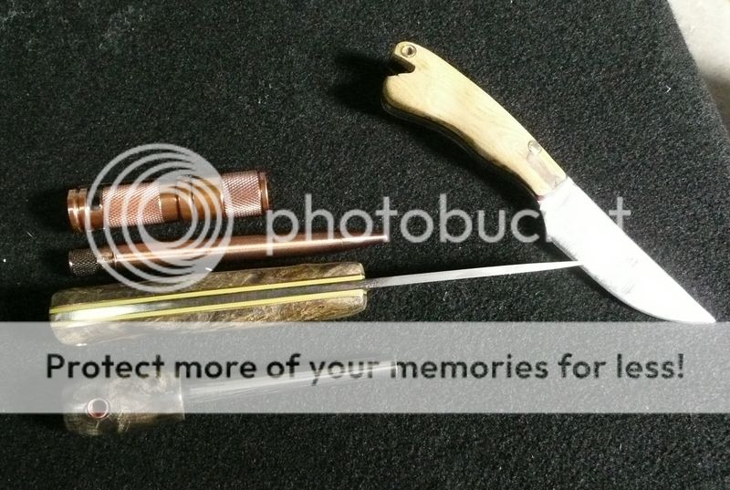 A copper Hinderer Investigator pen, and a copper Maratac AAA flashlight.Nice... what are the other two toys?