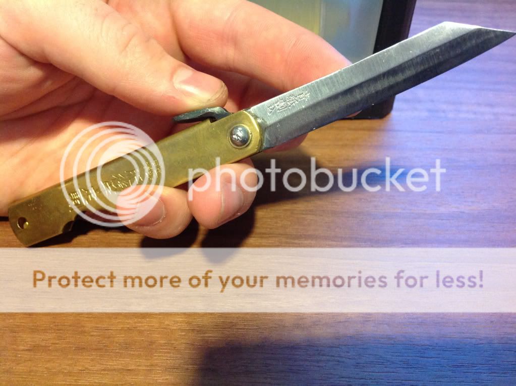 A japanese made Higo-No-Kami friction folder. Folded over brass and definately a cool knife if you want to try out a friction folder. Very slim and easy to pocket. Blue steel I think is the steel type.