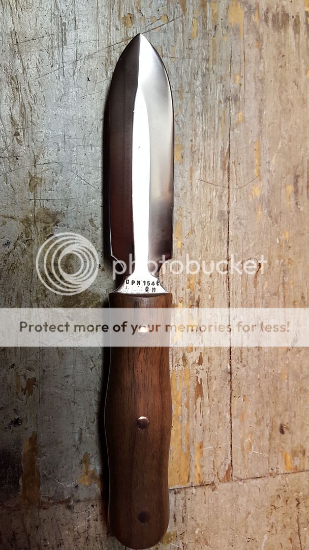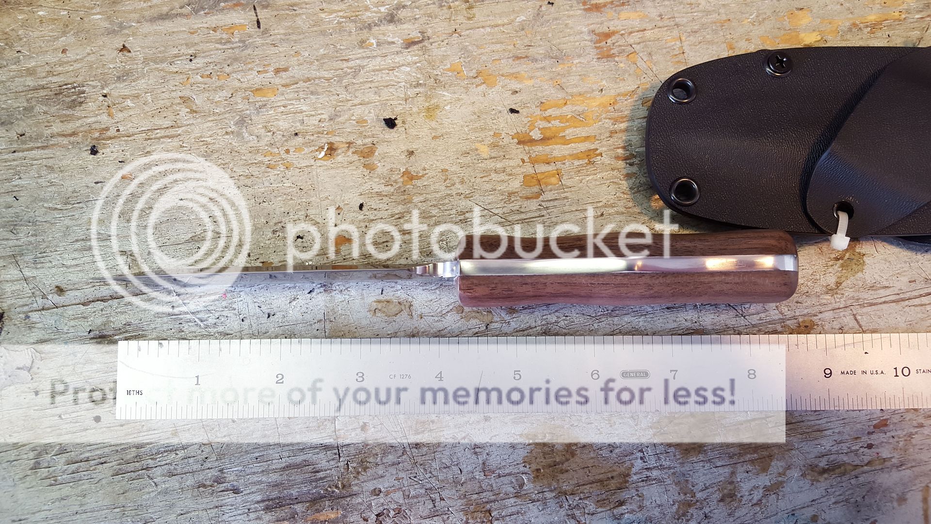 Total length is 8.5 inches the cutting edge in front of the choils is 4 inches, in front of the scales 4.5 inches. Scales are made from American Black Walnut, pins from 416. Mirror finish on the blade and very sharp. I miss-stamped the blade where it says CPM-154-CM and the bevel is off just a little. If you look carefully in the images you can see it. Lots of family stuff going on right now. So I will be selling this as a second. Nothing wrong with the knife just not perfect.