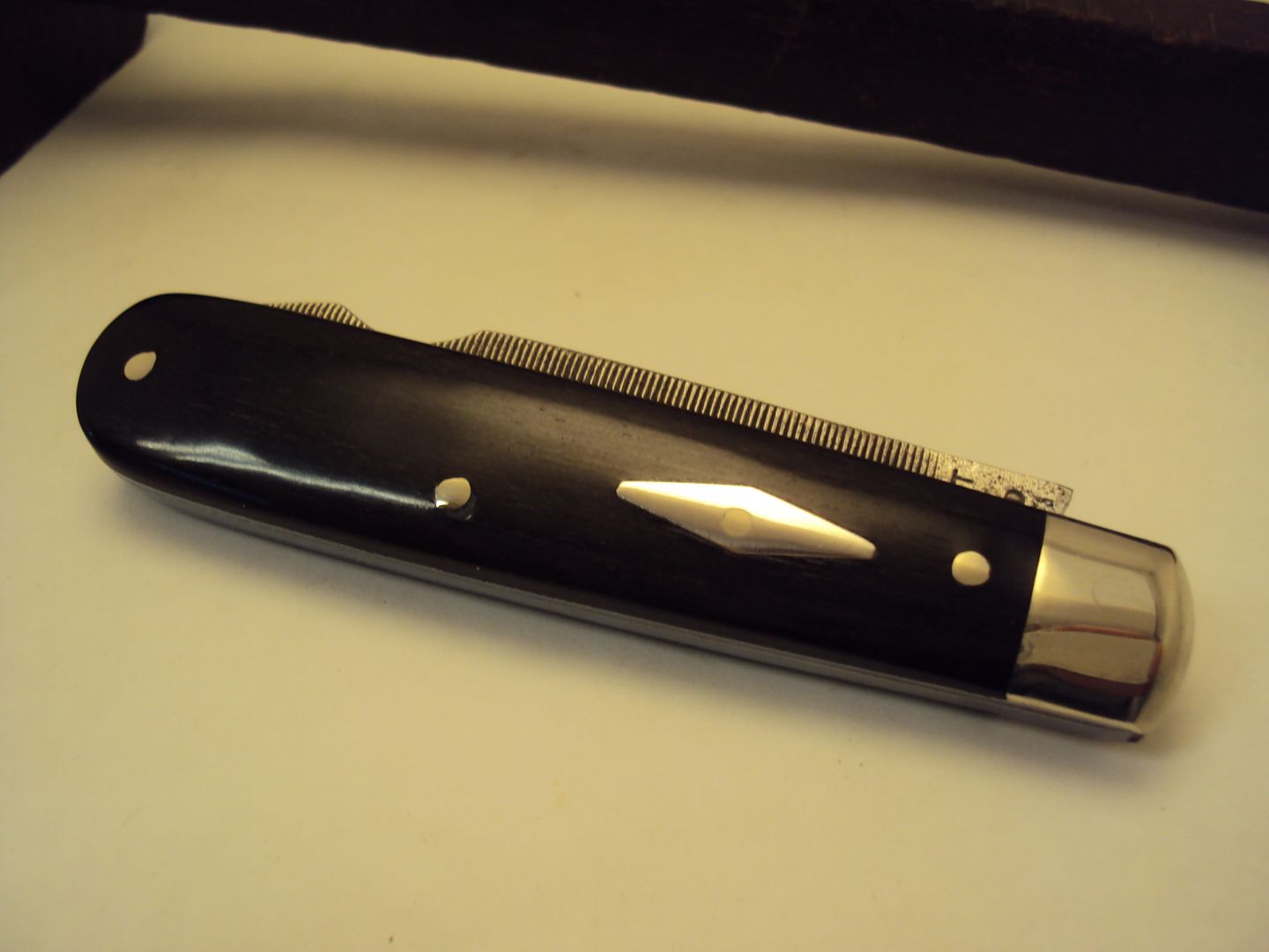 Next was a neat old ( in my eyes anyway lol ) TL-29, a single bladed version that is Broad-Marked, but the scales were horribly past their use-by date - the blade is old, and I asked if Glenn could use Ebony on this ol' girl - I thought this would suit the knife.