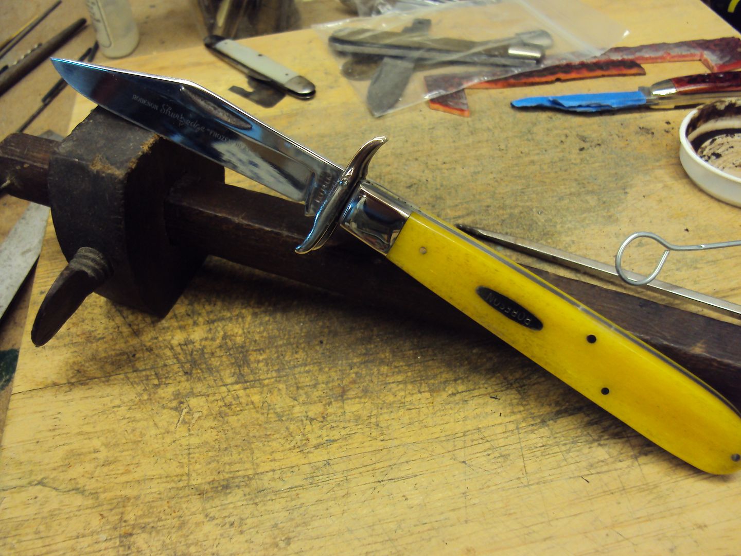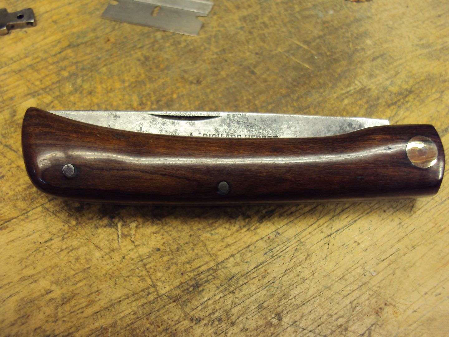 The next knife was a Rich. Herder Soddie-these are hardy, great knives - I like them, this Cutler does very good work - Glenn retained the original Wood scales - I didn't recognise this as the wood looked so good, Glenn also totally pulled the knife apart and completely rebuilt it -as he did the Robeson, he didn't polish the Blade - something I am extremely thankful for - this knife had terrible play - it was past the stage of tightening and re-peening...it was in my opinion pretty useless as is....