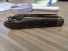 Due to the condition of the wood covers, I didn't want to take a chance at fully taking it apart. I was able to swing the springs and clean them and the liners to get the rust off of them. The original knife had a shield at one time. Through catalog pics, I found a very close match. I gave it a rounded worn look to match the rest of the knife. We chose to leave as much of the years of use on the knife as possible. The wood got some Formby's lemon oil, and the metal parts got a generous coating of Rust-Free. I sharpened the pen blade, but left the main to the owner, so he could have a better connection to his dad's knife. All in all, it didn't turn out too bad, and the owner is happy that he gets to carry his dad's knife again. Here's a couple after pics...