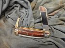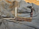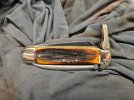 Anyway, here is a project I recently finished. The owner of this Kabar wanted the covers replaced with some amber stag. The existing covers were broken/cracked, IIRC. I cleaned it up a bit, but not too much, re-pinned the shield, and retipped the main blade. I really like how this turned out, I was sad to see it leave...