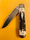 This next one started life as an EO utility knife. I think it was a Kutmaster, but the blade stamp was ground off as a second. Still, there was nothing wrong with it in my eyes. I dressed it up with some of my stag. It's a smaller one, around 3 1/4" closed. It's pinchable and not stiff on the fingers opening and closing.