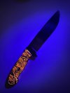 I had this pretty big piece of N690 steel that I didn’t really have a plan for, so I put it together with some CCL UV glow composite that I picked up at Blade Texas. Turned out pretty interesting.