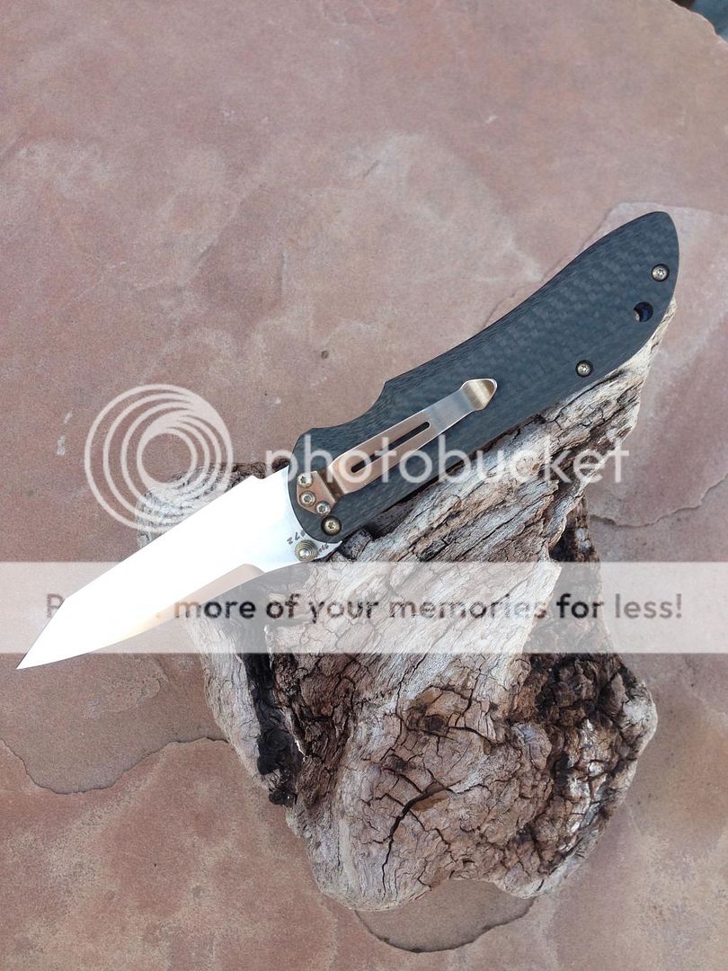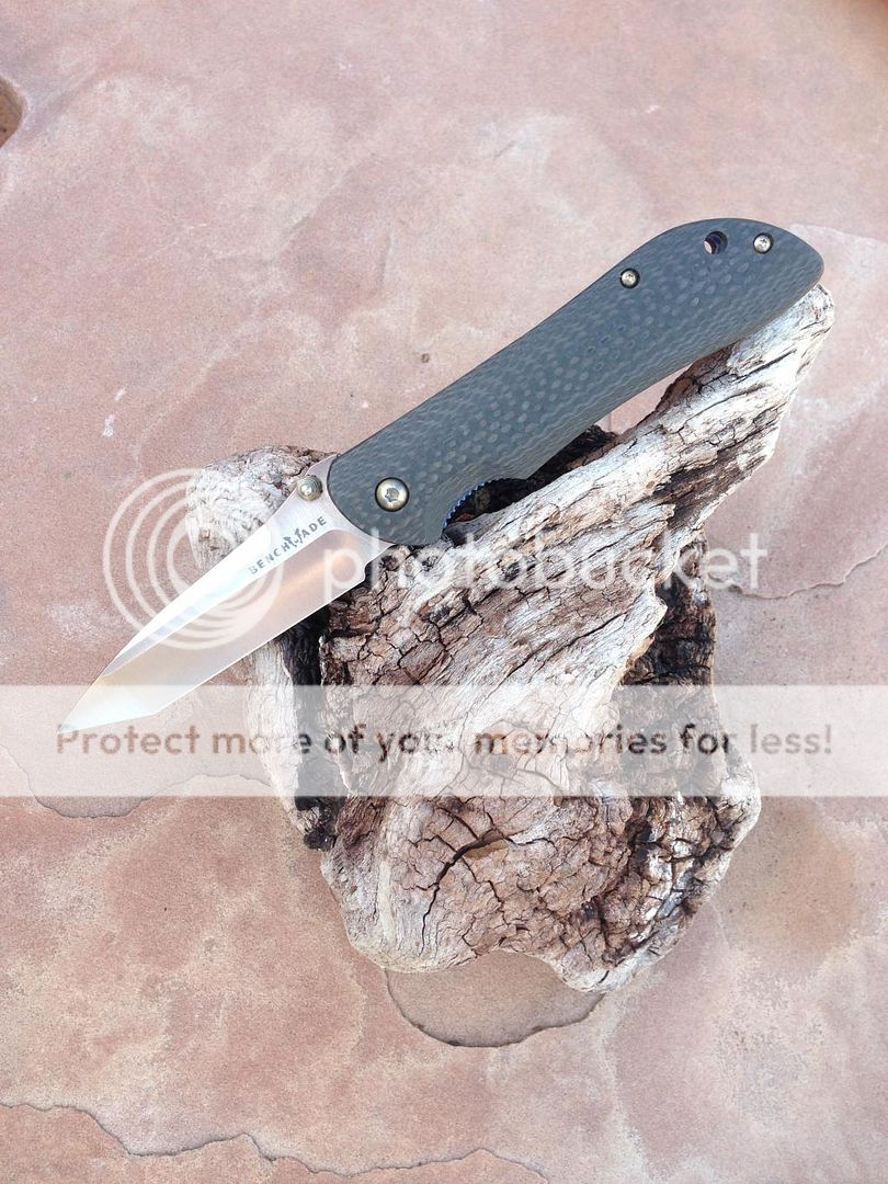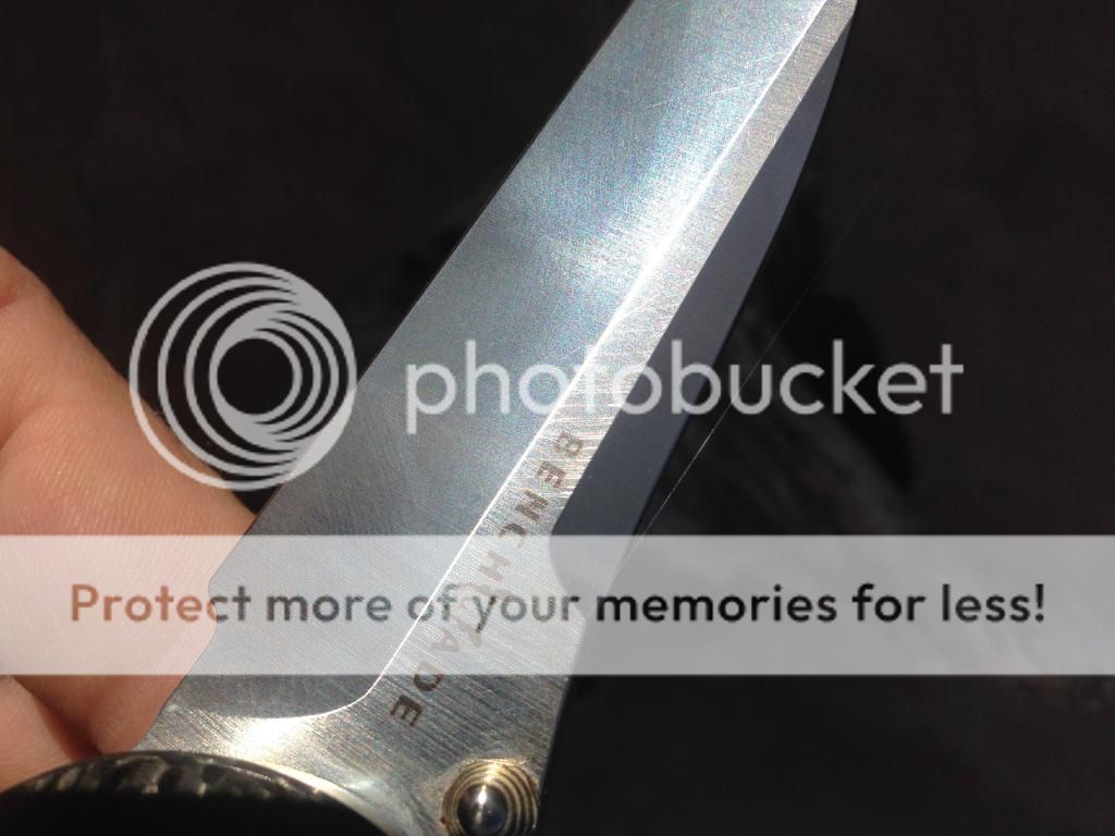 Previous owner had it in a display case so it has some superficial scratches from the stand (I tried to get the best shot of it). Full disclosure the knife itself is 90% condition (my 90% is others 98%) The price has been adjusted to accommodate for the missing box and papers. I will ship in a Benchmade draw string bag packed well.