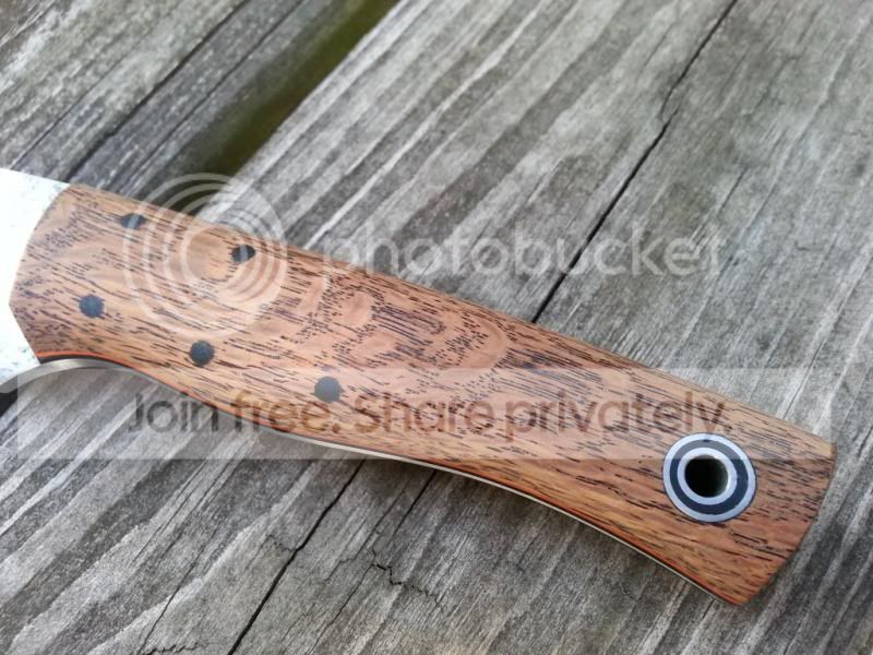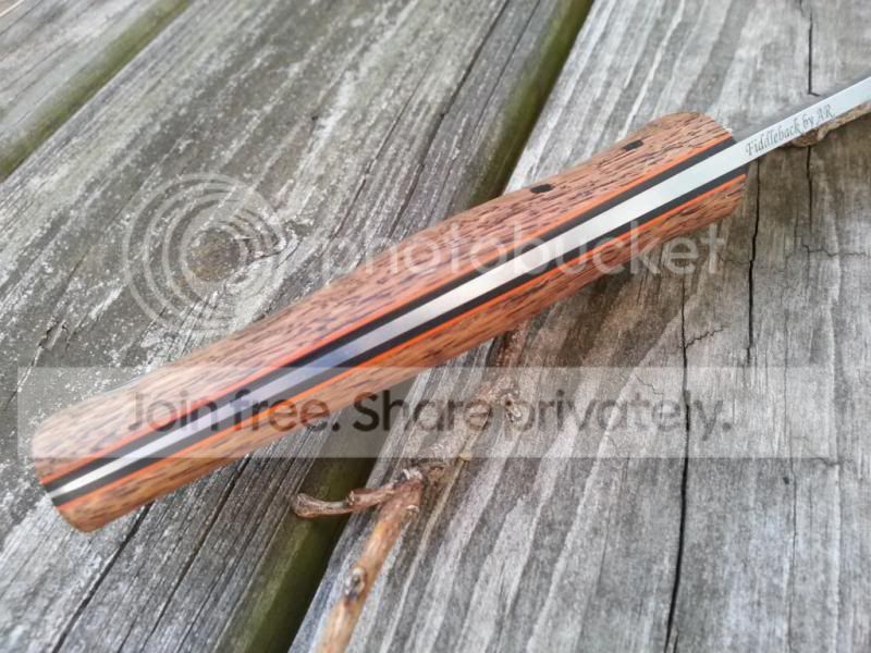 2013 0329 15 Hunter, Stabalized Dyed Lacewood over black with an orange pinstripe, Tapered Tang, Convex on 5/32 thick steel SOLD