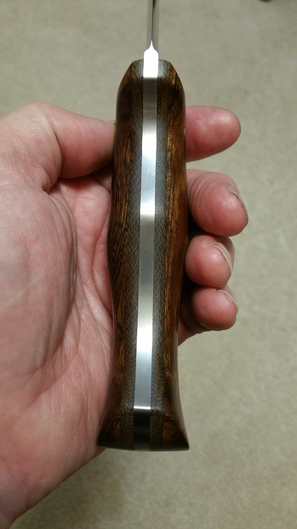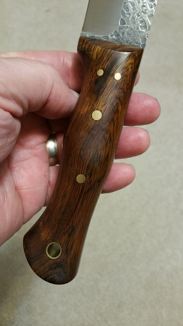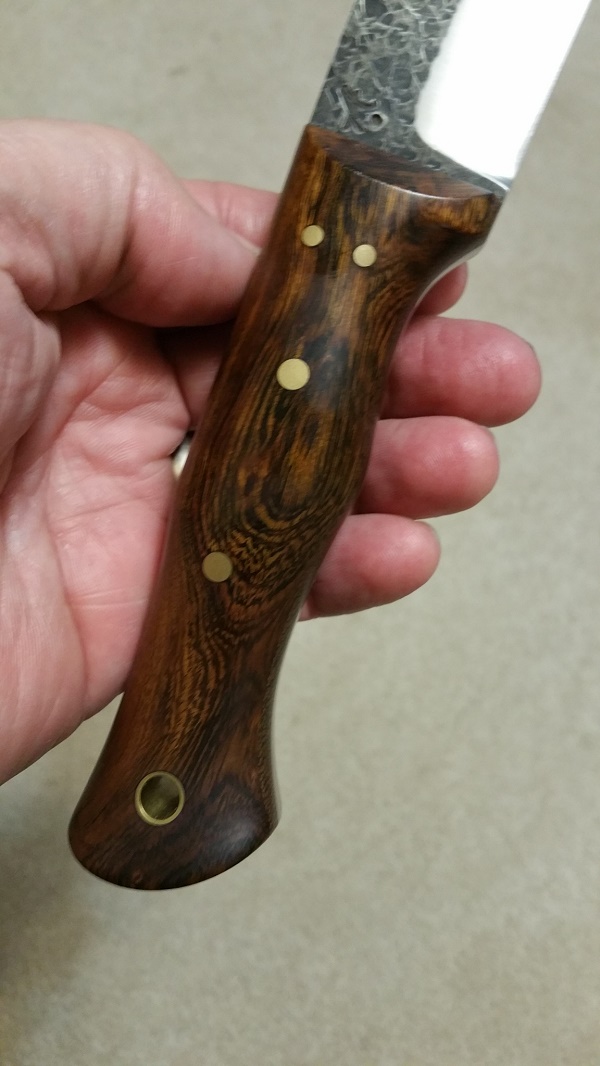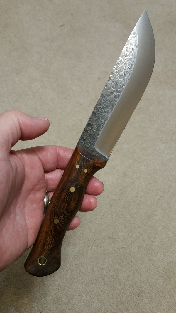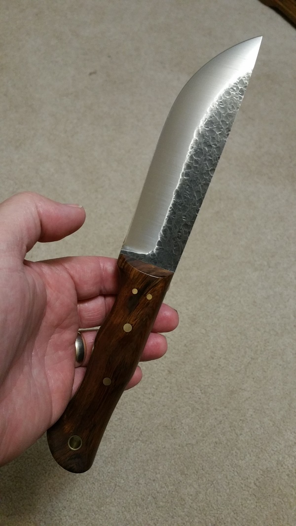 Up for sale is a beautiful AA Forge Leuku. Perfect convex grind (IMO) on 3/16" 52100 steel, 6" blade, 4.75" handle with outstanding ergonomics...this thing just 'melts' into your hand! Very sharp! Never carried or used... just admired! I honestly cannot find a single flaw on this knife. Beautiful Desert Ironwood over thick green canvas liners. Brass hardware and lanyard tube. $SOLD (firm on the price... I paid $270 for it)