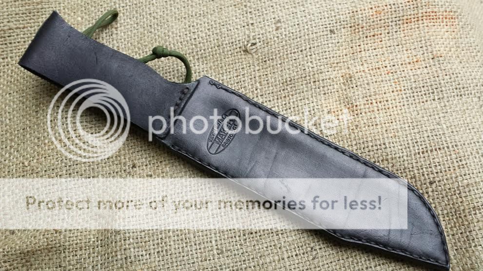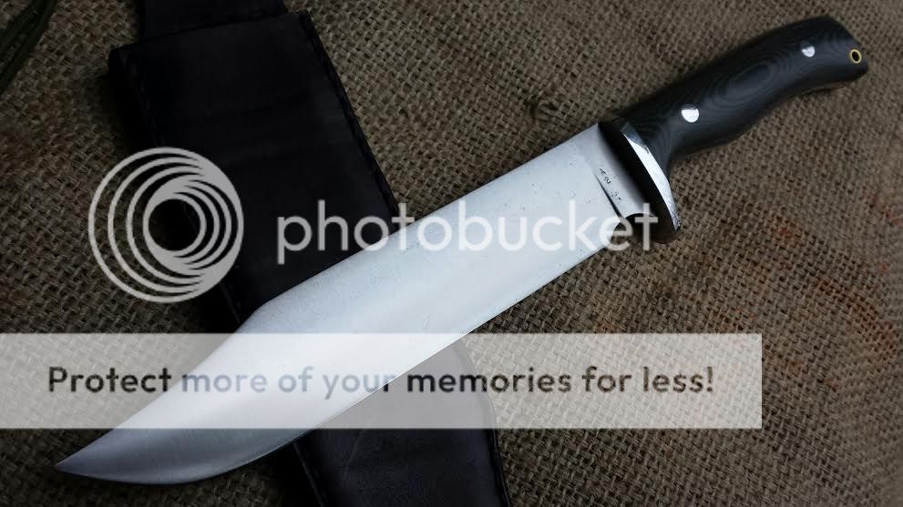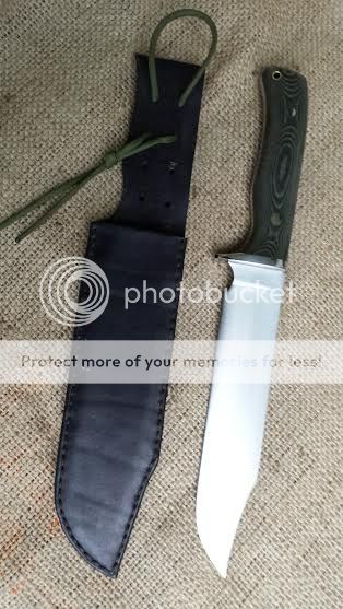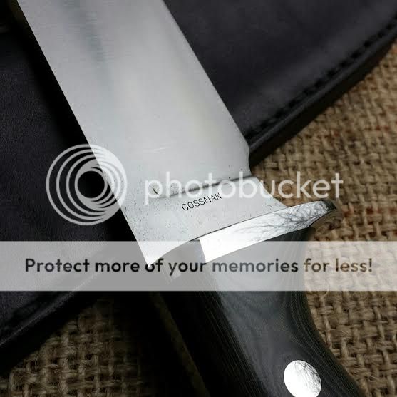 Custom Gossman Knives Tusker Bowie Knife. I ordered this knife earlier in 2013 and only used it a couple of times. It was sent to Bark River Knife and Tool for a polishing up and it is higher polish now.This particular bowie has an A2 steel blade with a clip point. The handle is Black and Green Micarta and the guard is 416 stainless steel which has been double pinned for rock solid attachment. I made the sheath and it is custom to fit this blade. The sheath has punched holes to provide retention via paracord or bungee cord around the handle and will easily fit a 2" wide belt. The knife has a 15" overall length with a 9" blade and 6" handle. The blade is .250" thick.