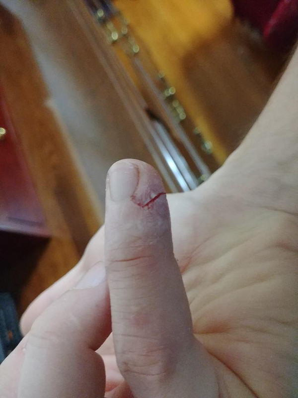 It went right down the blade and the only reason it didn't go to the bone was that my fingernail stopped it.