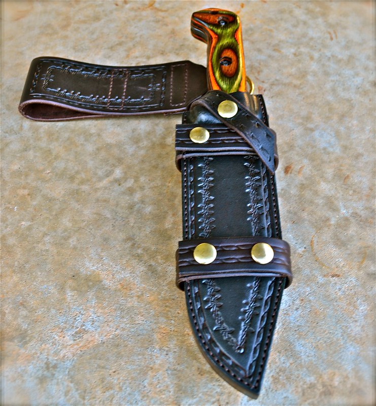 Up first is a Becker Bk7 that has been stripped and etched...comes with custom scales and a very very badass custom sheath...Sheath can be dangled or the dangle can be removed for scout style carry...The sheath is heirloom quality hand made by one of our members here...Price is $150.