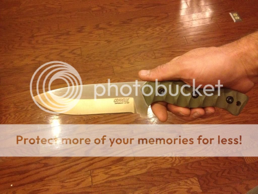 Up for sale is my Gravelle Field Knife-medium. I've had this knife +/- 1 yr and don't use it much so here we are. It has been on a couple hunting and 4-wheeler trips and proven to be a very capable blade. The sheath got a little bit of dirt in it on one of these trips which is where the small scratches came from. I freehand sharpened it once and it will shave. The steel is S-35vn, .200 thick, 5.5" long. G-10 scales with OD green sheath and tek-lok. I am asking $180 net to me and I cover priority shipping. Not really interested in trades at this time. I can provide additional pics upon request. First to post wit " I'll take it" followed by an email gets it. Thanks for looking!