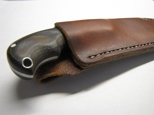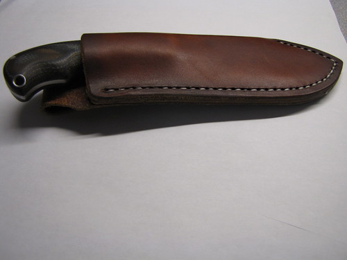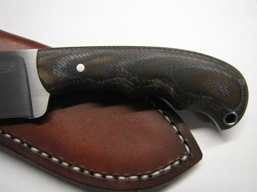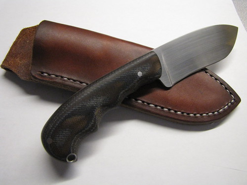 The knife included a handmade leather sheath, and scales are a bluejean/carhart micarta. The look and lines of this knife were what sold me, as I'm a sucker for a nice recurve. That, along with a little more detail from Greg Shahan regarding the steel and his heat treatment, to quote a PM from the maker: