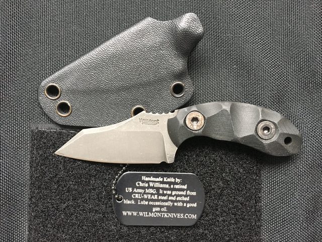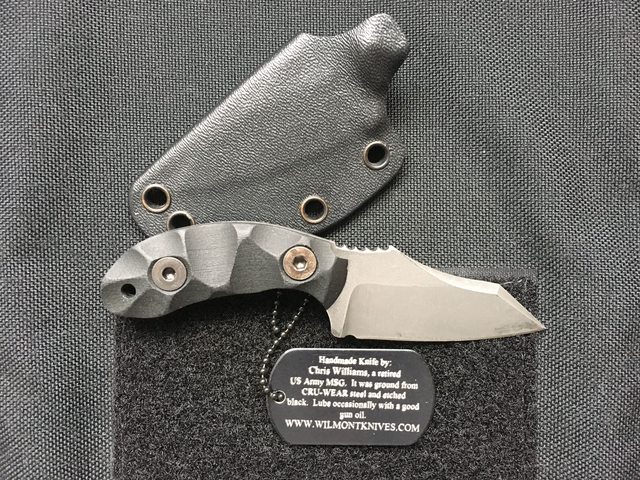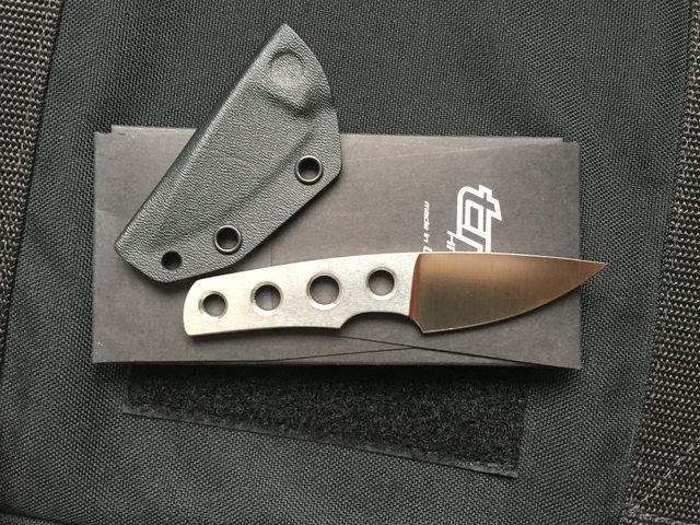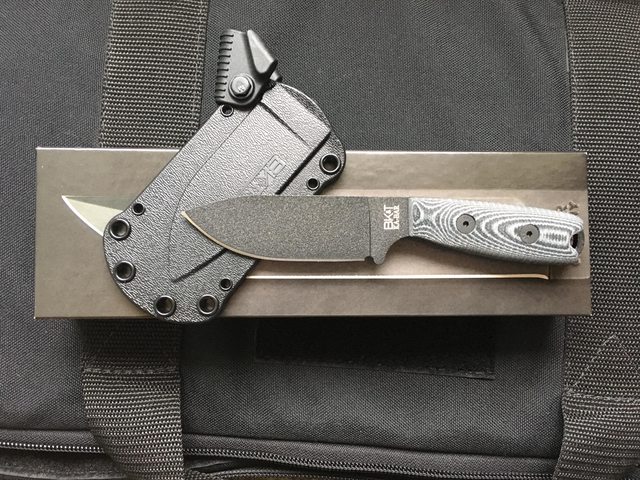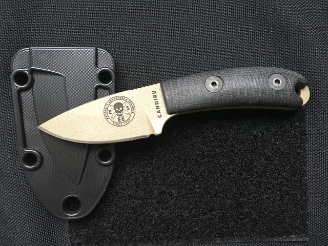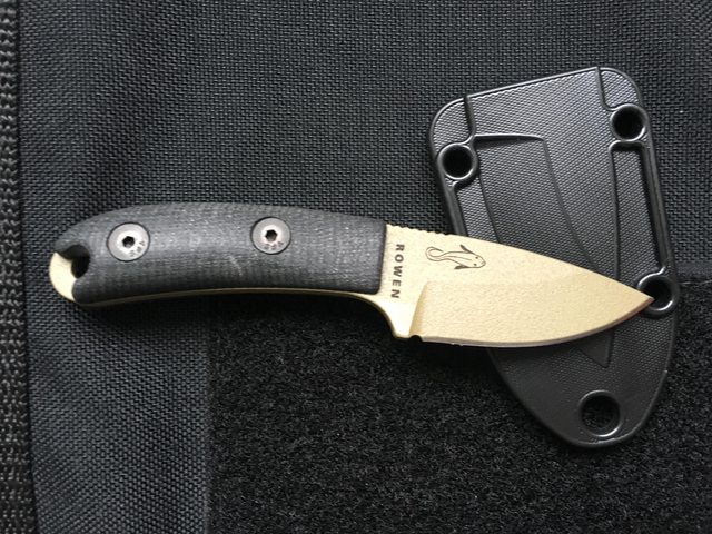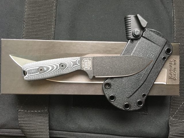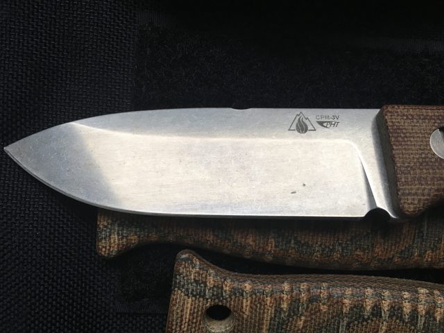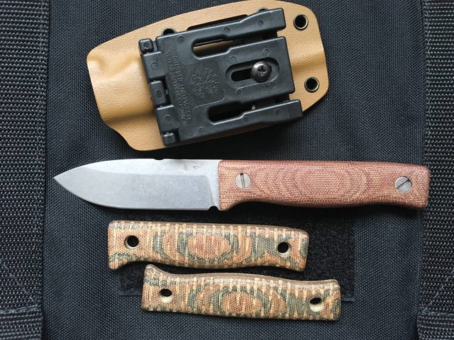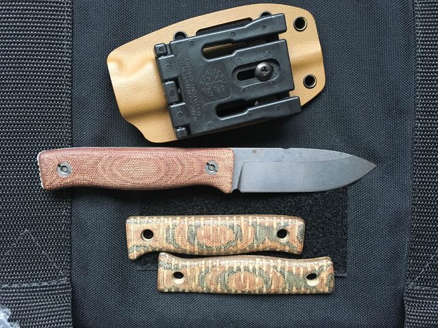 Had this one a while, used it very lightly and have changed up the scales. Comes with natural micarta scales, tan sheath(with teklok) and an extra pair of camo scales that have been textured by me. No box. There is a little rust spotting on the blade, but should come off with some cleaning. Edge is great-no chips, burrs or nicks.