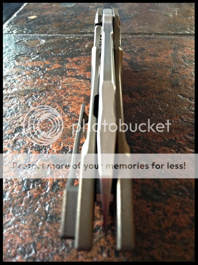Handle is satin, bead blasted and anodized titanium frame and tip up clip and a satin finished two-piece backspacer