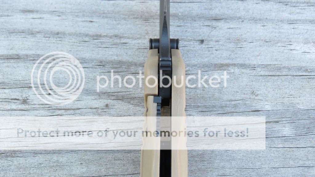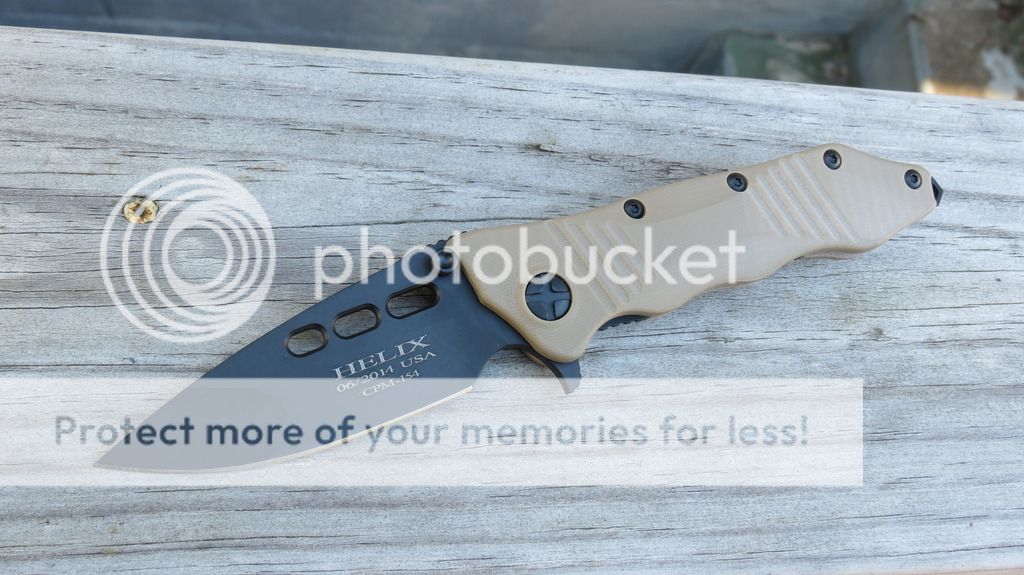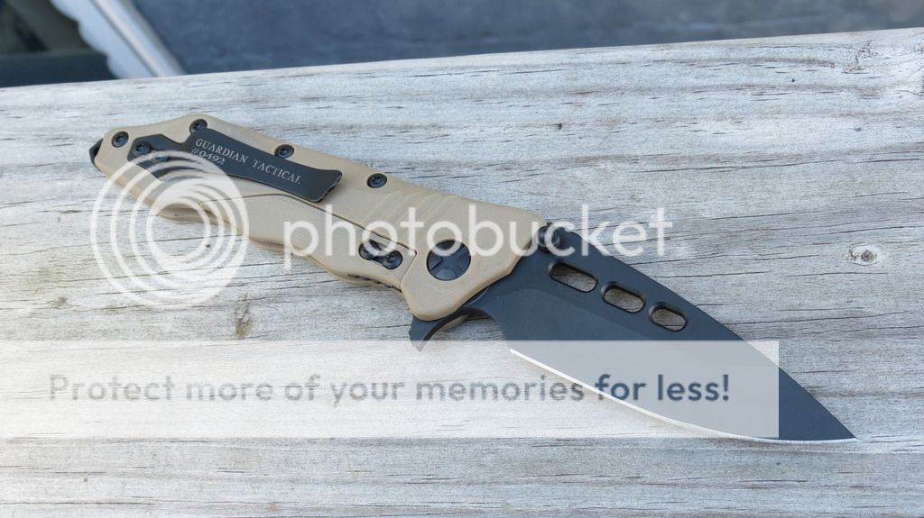 Guardian Tactical Helix with black CPM-154 blade and desert tan G-10 handle. Comes in original GT baggie and box. Dead centered, super smooth flipper on bearings, solid and early lockup. Carried it a couple times and opened a few packages (i.e. cut tape). It has 3-4 really minor marks on it...I had to look it over several times to find them. Full disclosure. $206 net shipped Paypal