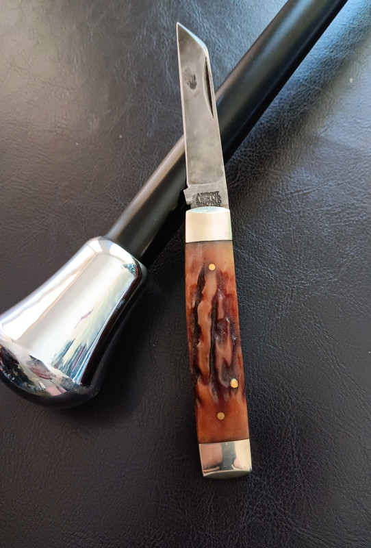 Adding one to the Guardians thread. Utica Cutlery lambsfoot folder, carbon steel. Straight edge with rounded tip, no signs of reprofiling, just honest wear from use. Walk and snap are still good. Picked it up recently and thought it fit here with the other working lambsfoot patterns. Appreciate any insight on era or similar Utica examples.