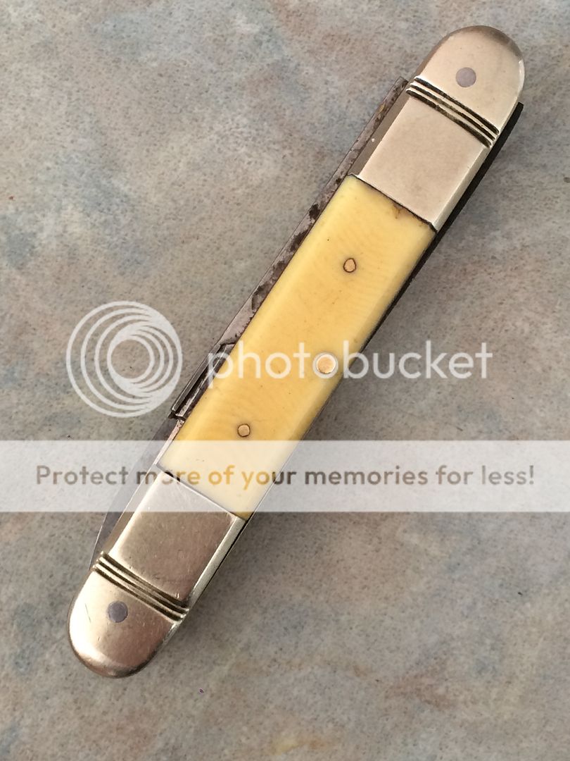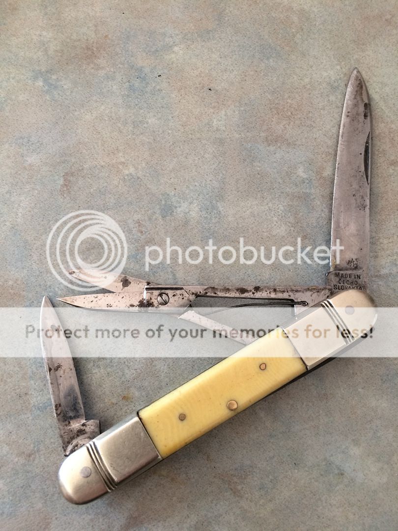 Then there's Dads knives!! Because of the broken backspring I basically got the ?French Ivory? Knife 2for1 with the half whittler, mostly as a curiosity as I've never had a Made in Chechoslovakia knife before. It's too bad the spring broke, looks like the blades are well made, main bring well used, pen hardly or not used at all. Good walk and talk in the sharp scissors, and I really liked the bolsters. Oddly they should be too big for me but threaded and stepped is interesting on it.
